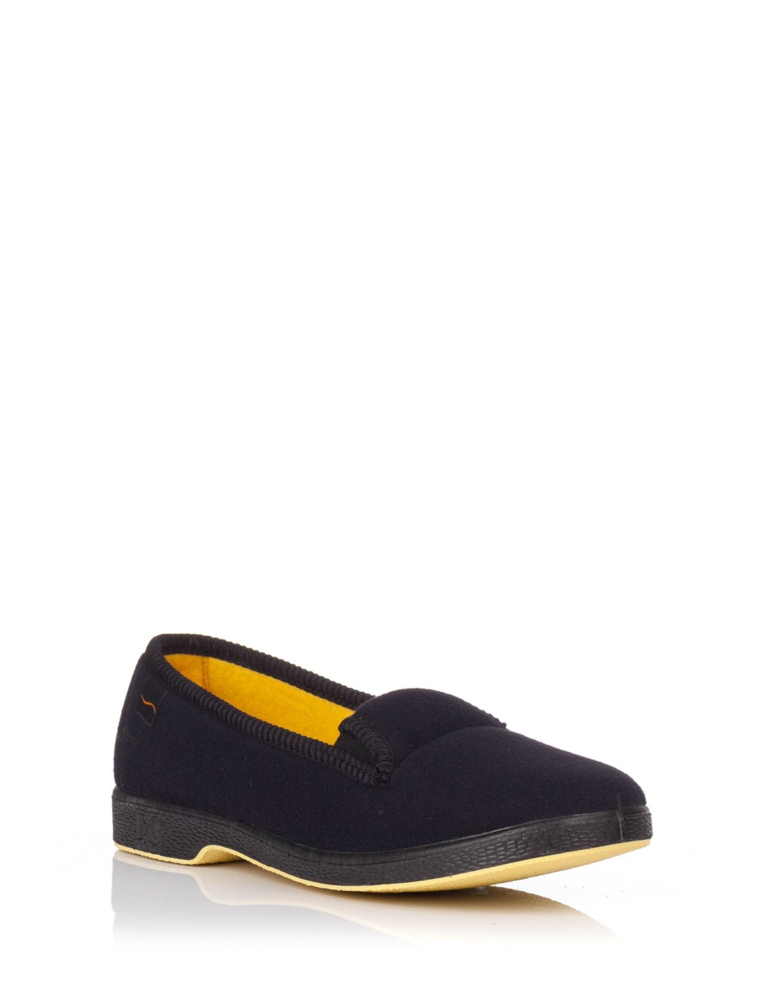 Doctor Cutillas nos presenta esta zapatilla de andar por casa para mujer, realizada en material textil paño en color negro, con elásticos laterales que facilitan su calce y ajuste al pie. Suela antideslizante. Fabricado en España.