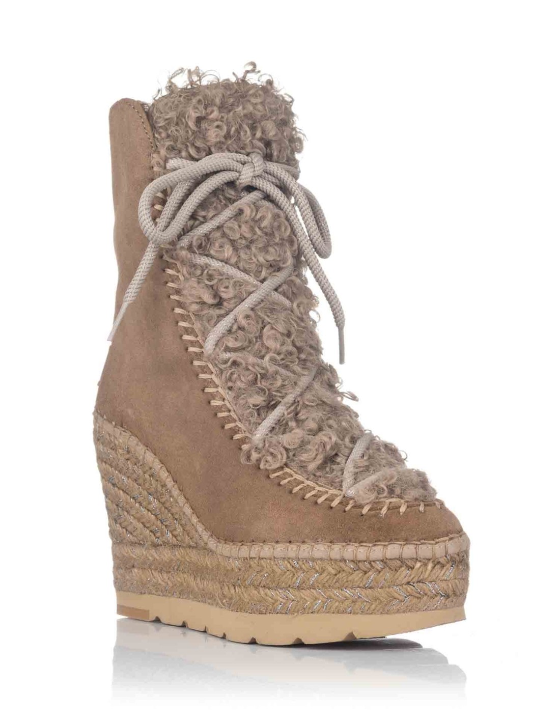 Una temporada más, la marca Vidorreta nos presenta esta bota australiana con cuña y plataforma de yute con tratamiento hidrófugo. Realizada en piel ante con detalle de pelo rizo vegano sobre la lengüeta y cierre de cordón. Forro de pelo suave y calentito para los días más fríos. Plataforma con hilos metalizados y suela de Eva. Cosida a mano y fabricada en España.