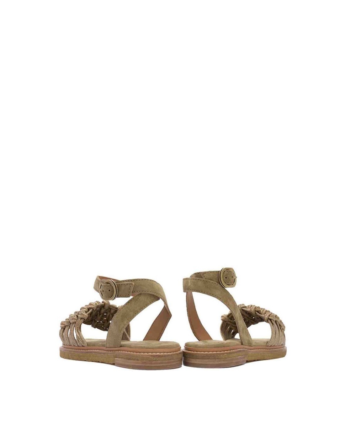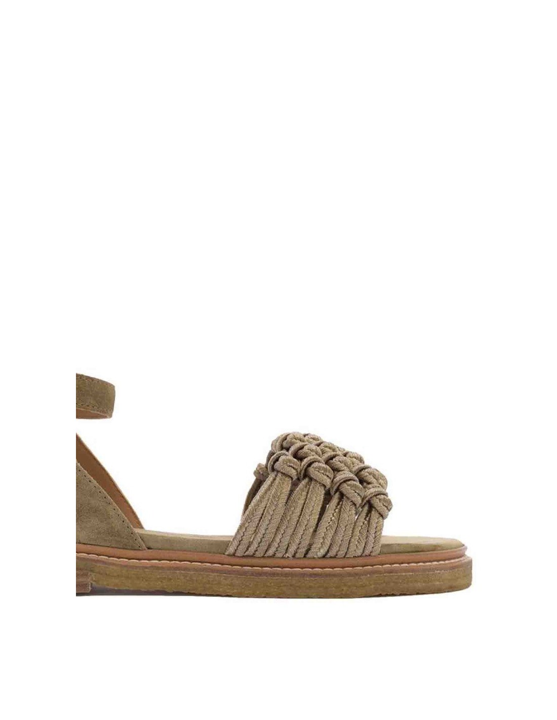 Sandalia de la marca Alpe para mujer, realizada en piel ante en color verde kaki con la pala formada por tiras en textil con detalle de nudos. Cierre mediante pulsera tobillera con hebilla. Fabricado en España.