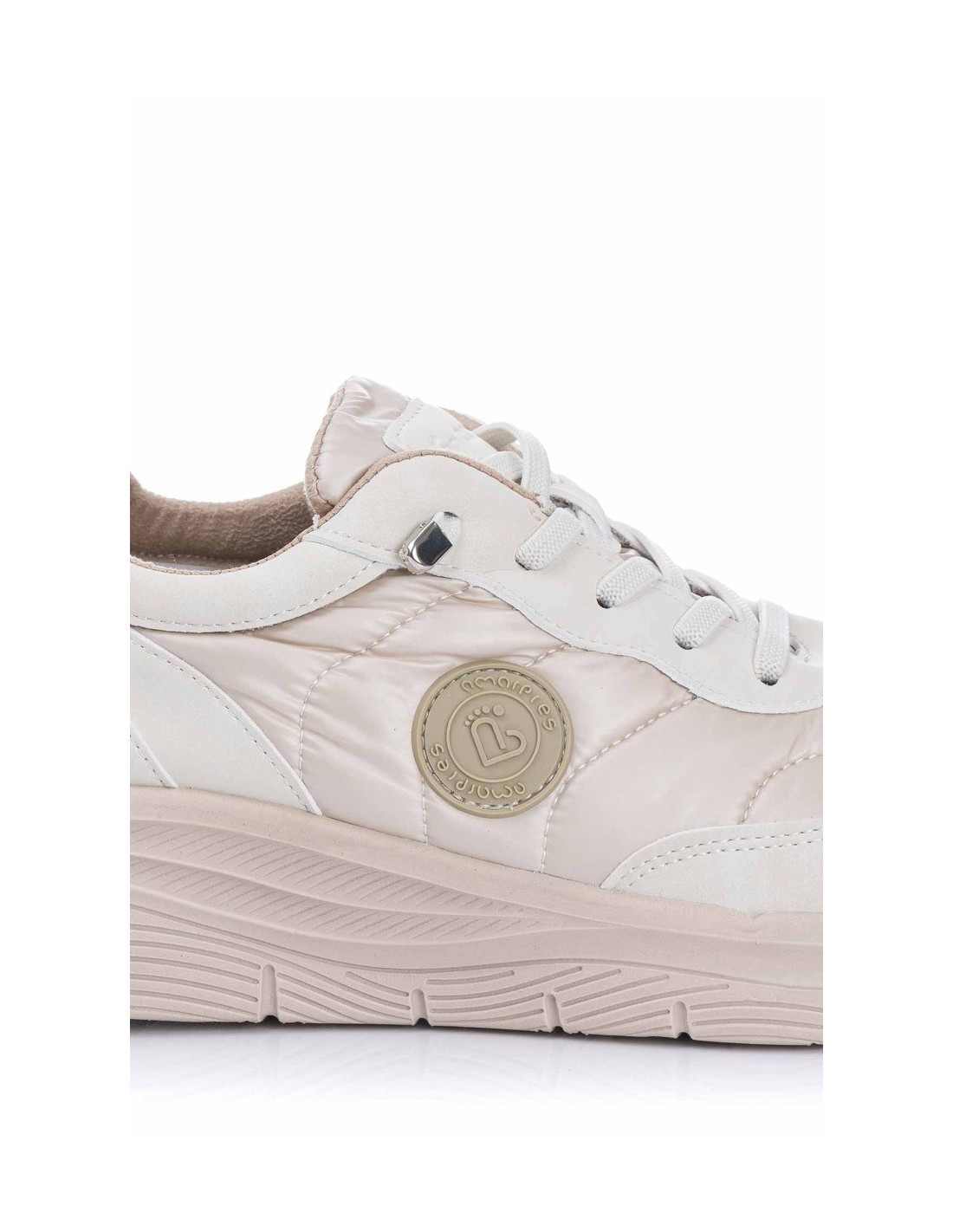 Sneajker de la marca Amarpies para mujer en color metalizado, realizado material sintético en combinación con textil. Plantilla extraíble acolchada “Memory esponge ” que amortigua la pisada y se adapta a la forma del pie y su cierre con cordones elásticos facilita el calce. Suela ultraligera de eva
