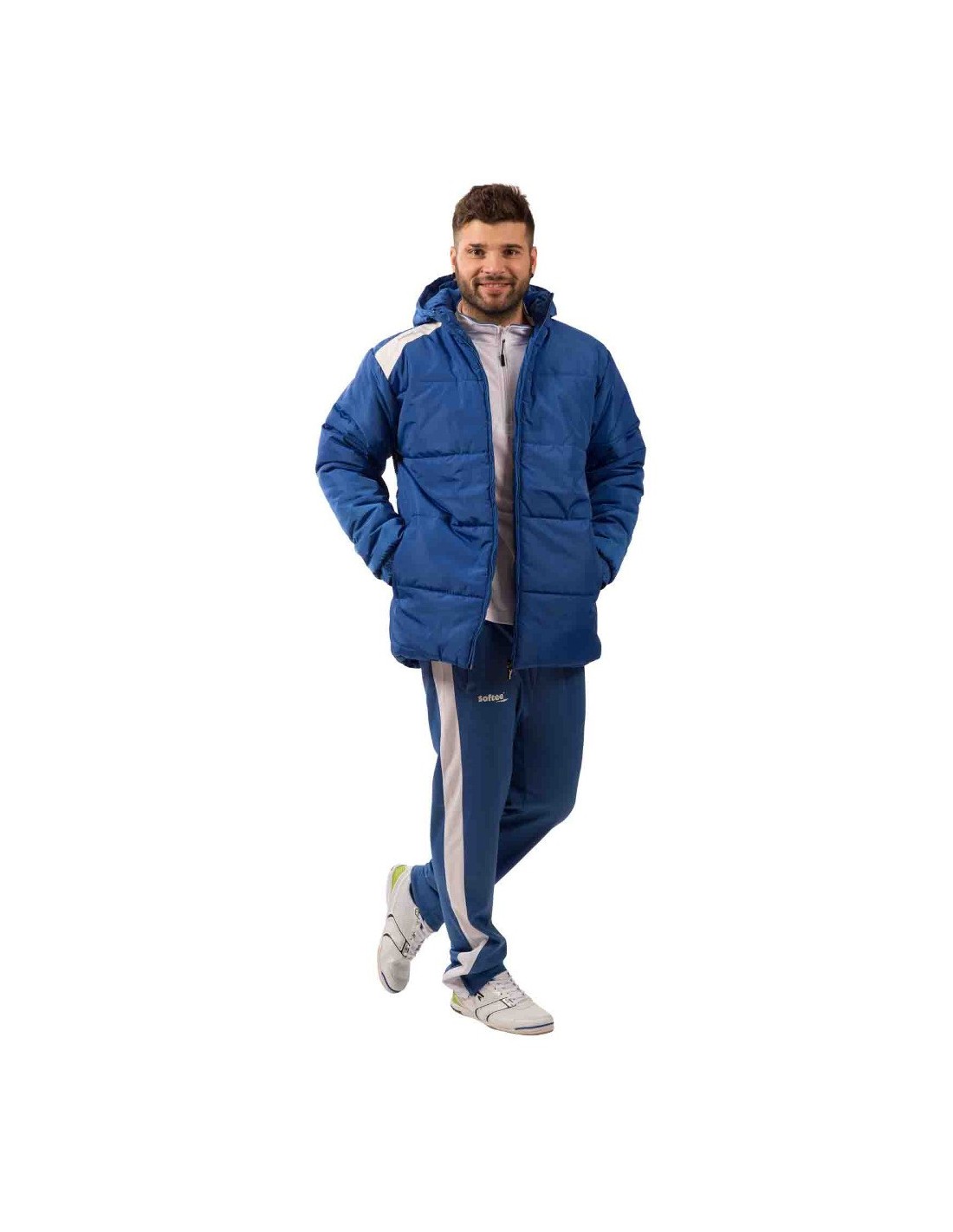 Anorak con capucha para hombre, realizado en poliéster acolchado en la parte externa y en el interior. Formado por dos bolsillos laterales con cierre de cremallera y dos interiores con velcro. Logo de la marca en la parte superior derecha.