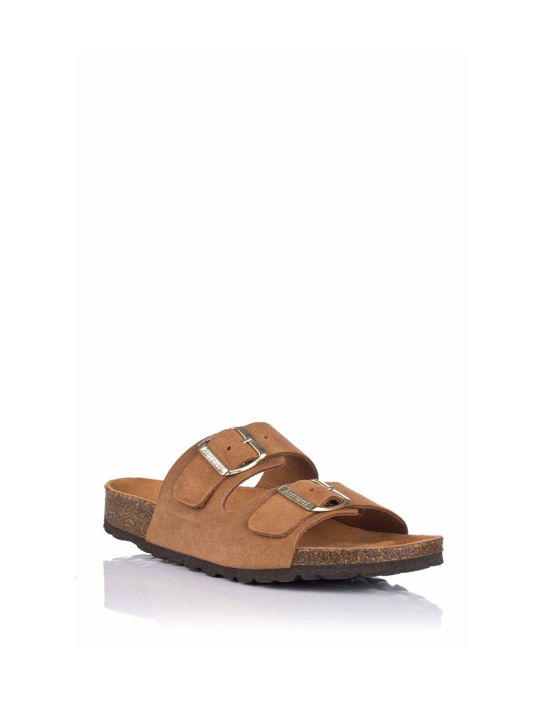 Sandalia para mujer, realizada en piel con cierre de doble hebilla ajustable. Planta anatómica con acolchado confort soft carbónico y corcho natural antibacteriano. Fabricada a mano en España por la marca Autenti be comfortable.