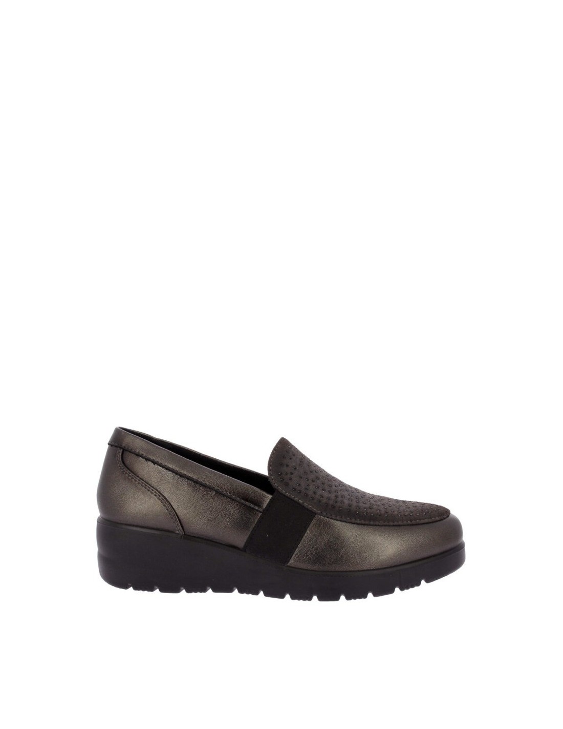Mocasín de la marca Doctor Cutillas para mujer, elaborado en combinación de piel sintética con textil ante con detalles de brillantitos en el empeine con forro interior textil y plantilla acolchada de gran comodidad. Elástico en ambos laterales, para una mayor sujeción. Piso de goma antideslizante.