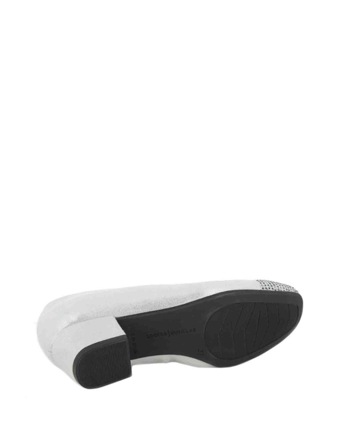 Zapato salón con detalle de pedrería en la puntera para mujer. Confeccionado en material textil efecto metalizado con forro interior textil y plantilla extraíble acolchada de gran comodidad. Fabricado en España por la marca Doctor Cutillas.