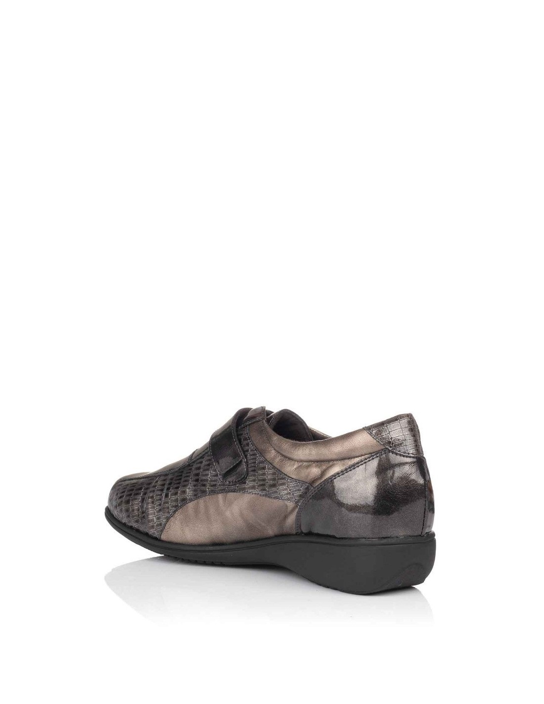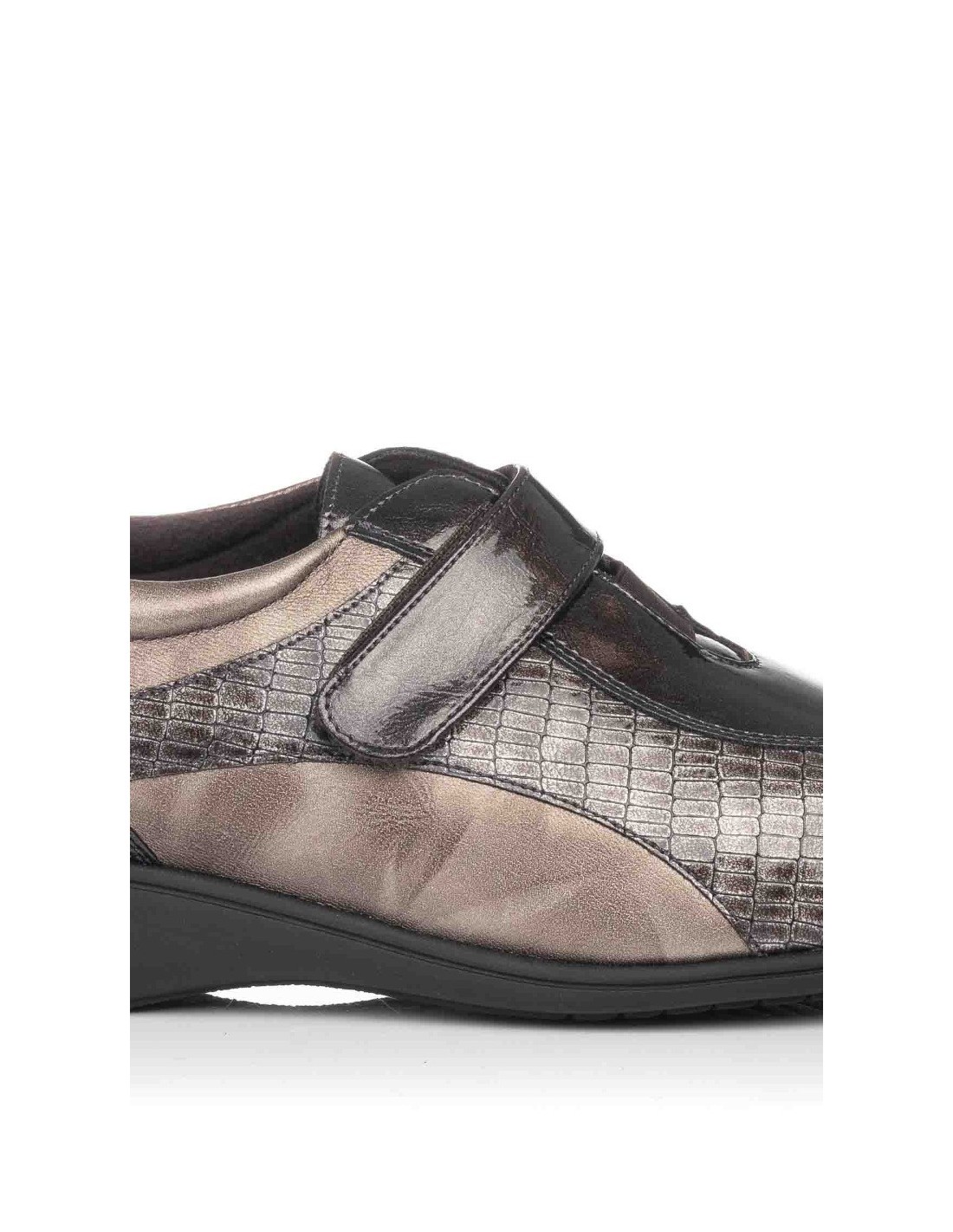Zapato sport de mujer, combinado en piel lisa con cortes en charol sintético liso e imitación reptil. Forro interior textil y plantilla extraíble para mayor higiene. Sujeción mediante elástico central y cierre de velcro para facilitar el calce del pie. Suela de goma antideslizante. Fabricado en España por la marca Doctor Cutillas.