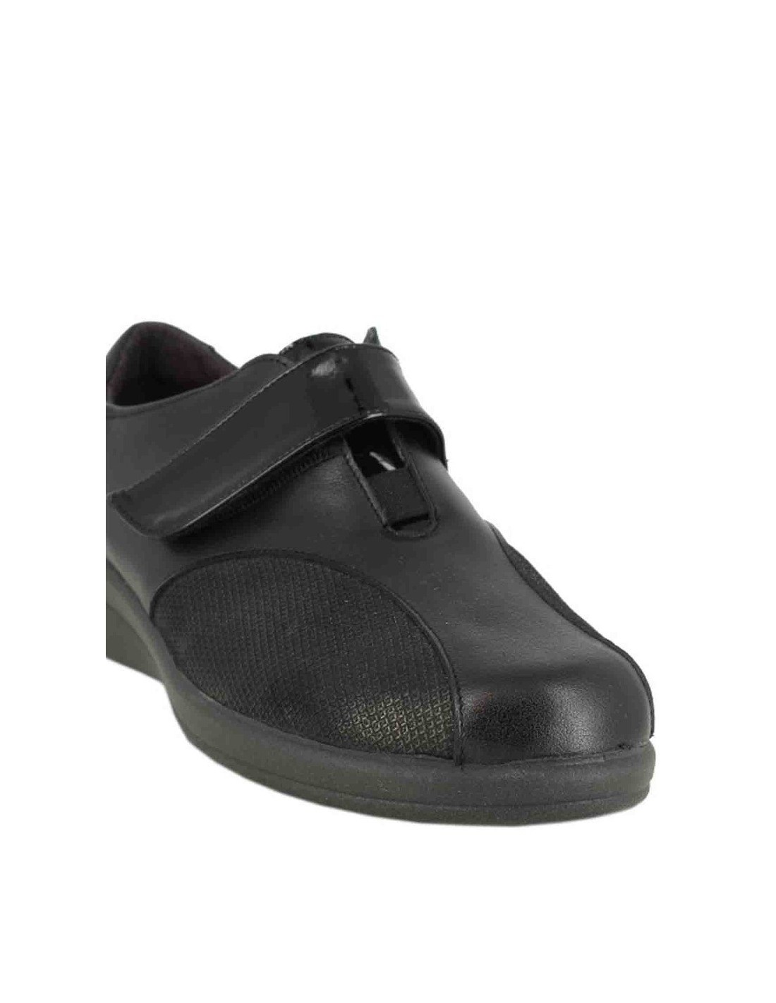 Zapato de la marca Doctor Cutillas para mujer, realizado mediante paneles combinados de piel y textil. Forro interior textil y plantilla extraíble. Cierre mediante velcro y elástico en el empeine para facilitar el calce.