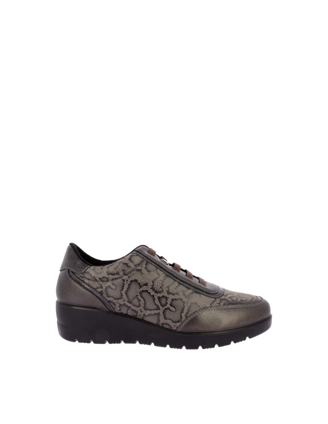 Zapato sport para mujer de Doctor Cutillas en color negro, realizado en piel sintética en combinación de textil diseño animal print Forro interior textil aterciopelado y cordón elástico para conseguir un mayor ajuste al pie. Suela ligera Confort light, flexible y preparada para absorber impactos. Plantilla extraíble para mayor higiene y comodidad.