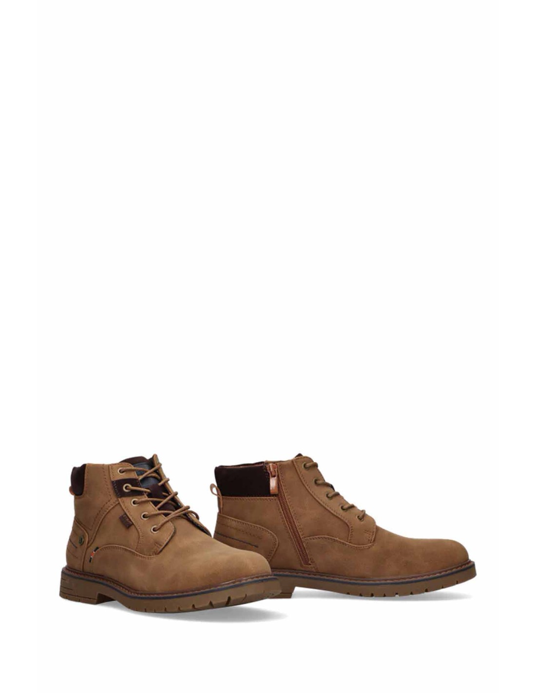 Botín para hombre de color camel, realizado en sintético con cordones y cremallera interior para un mejor ajuste al pie. Cuello acolchado y plantilla extraíble Soft comfort consiguiendo una máxima comodidad. Suela de goma para un mayor agarre.