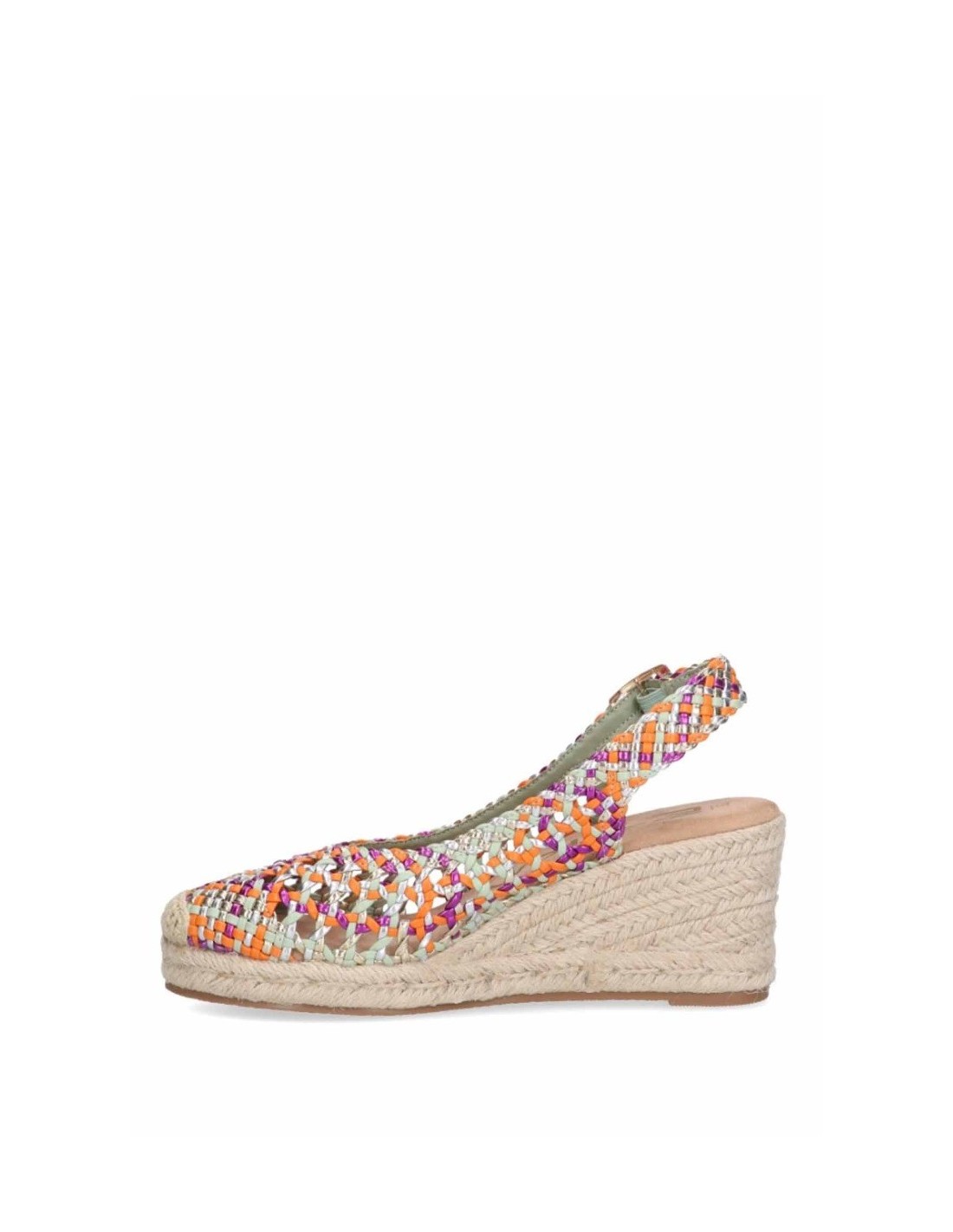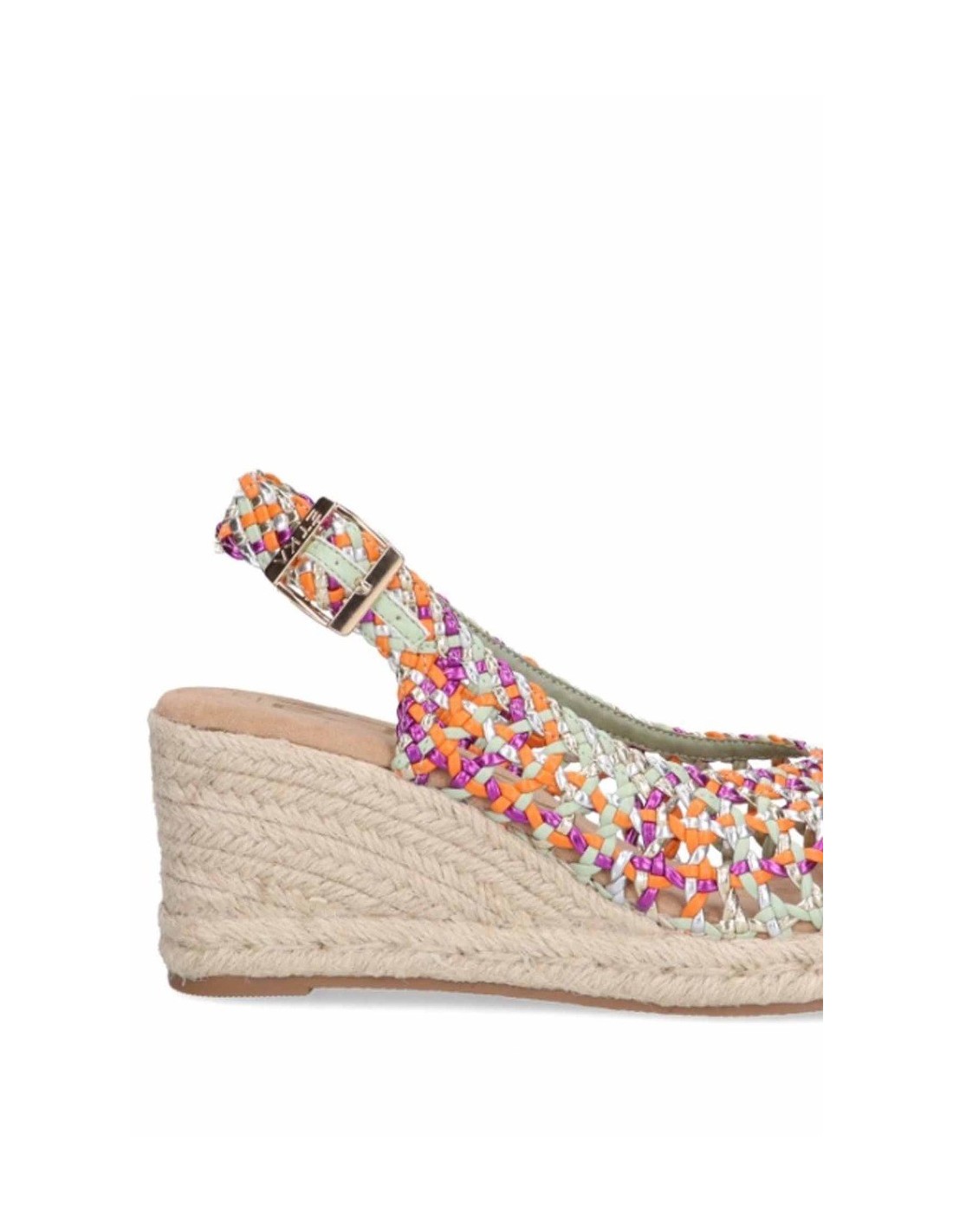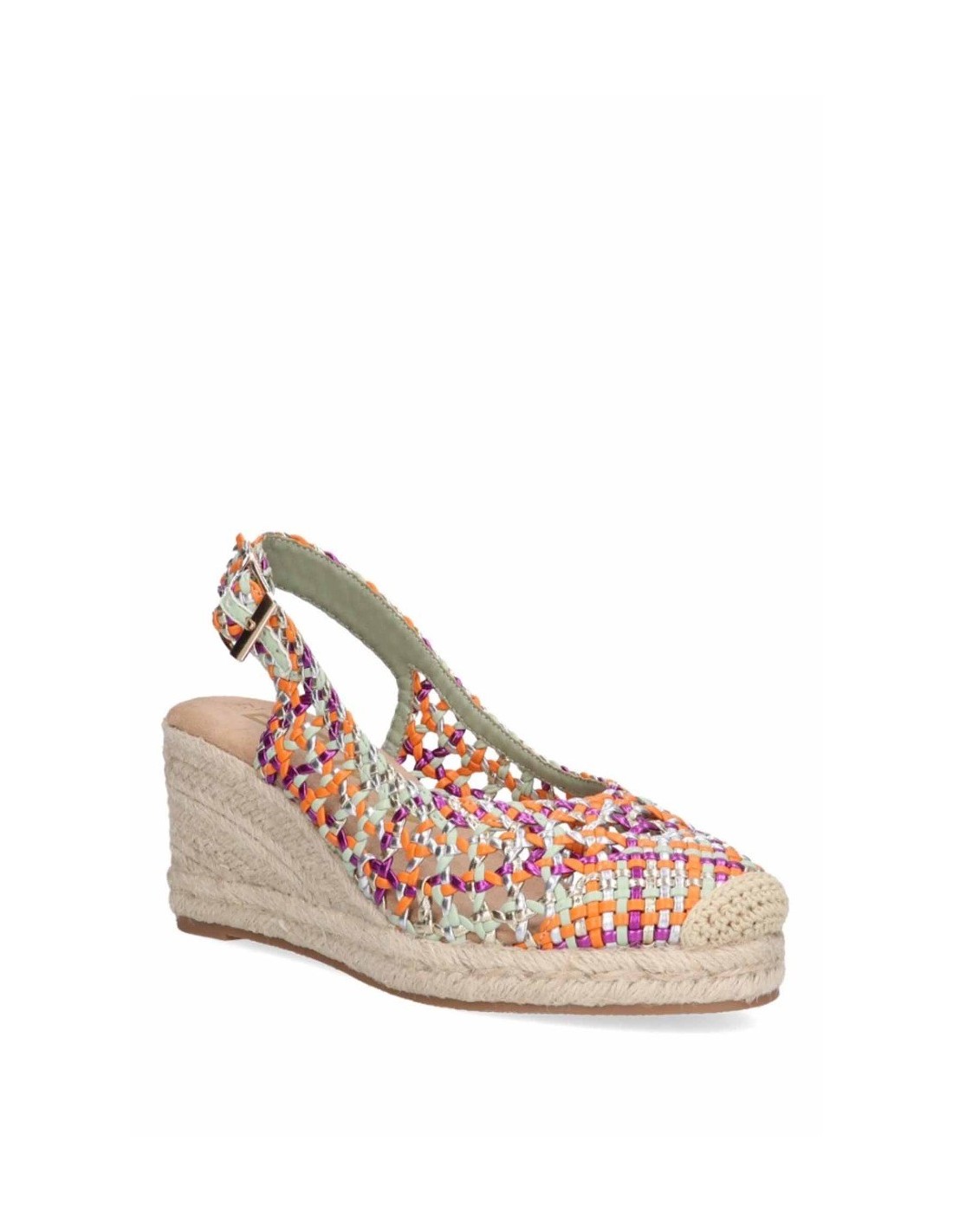 Sandalia con cuña de la marca Étika para mujer, realizada en material sintético trenzado en diferentes colores. Cierre mediante hebilla ajustable en tira trasera. Planta textil soft confort Cómoda cuña de esparto con la suela de goma antideslizante.