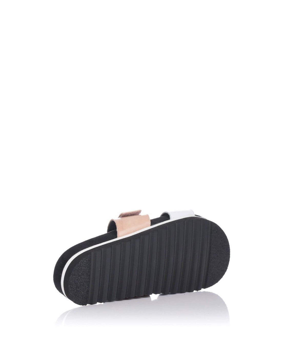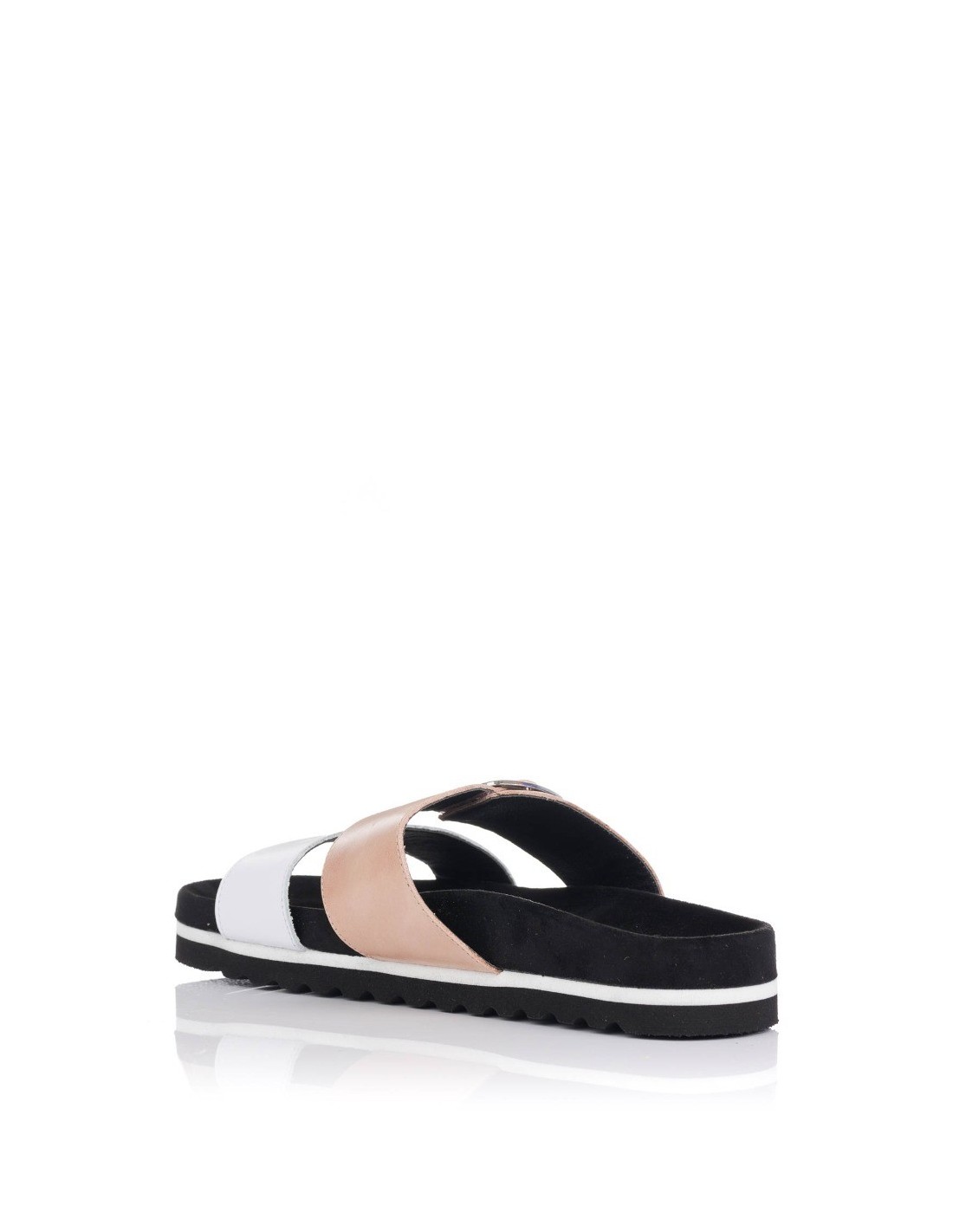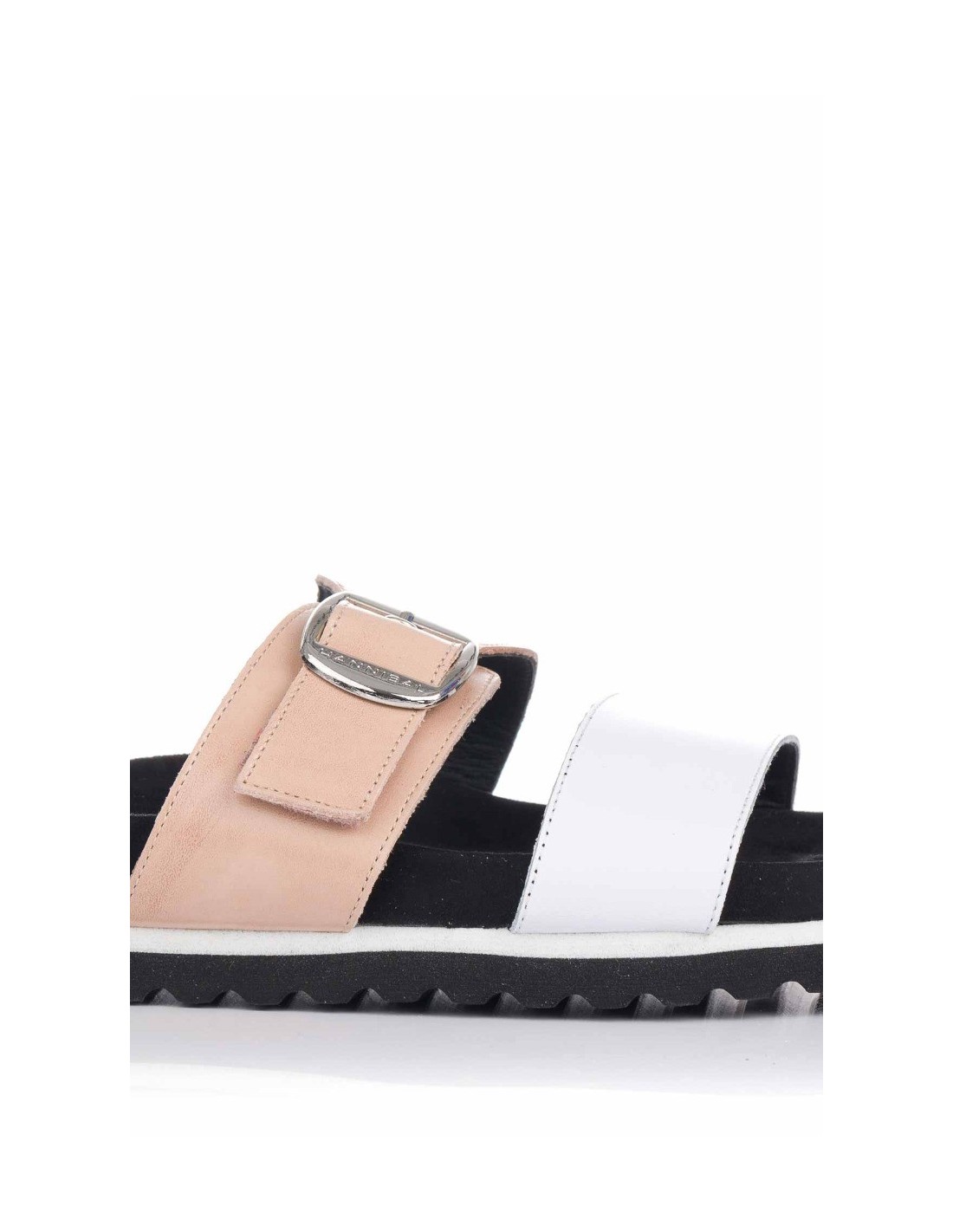 Sandalia anatómica de la marca Hannibal Laguna para mujer, realizada en piel en color blanco y negro con forro textil ante. Plantilla anatómica de gran comodidad. Cierre mediante tira con hebilla ajustable. Suela bicolor de Eva para mayor ligereza y comodidad.