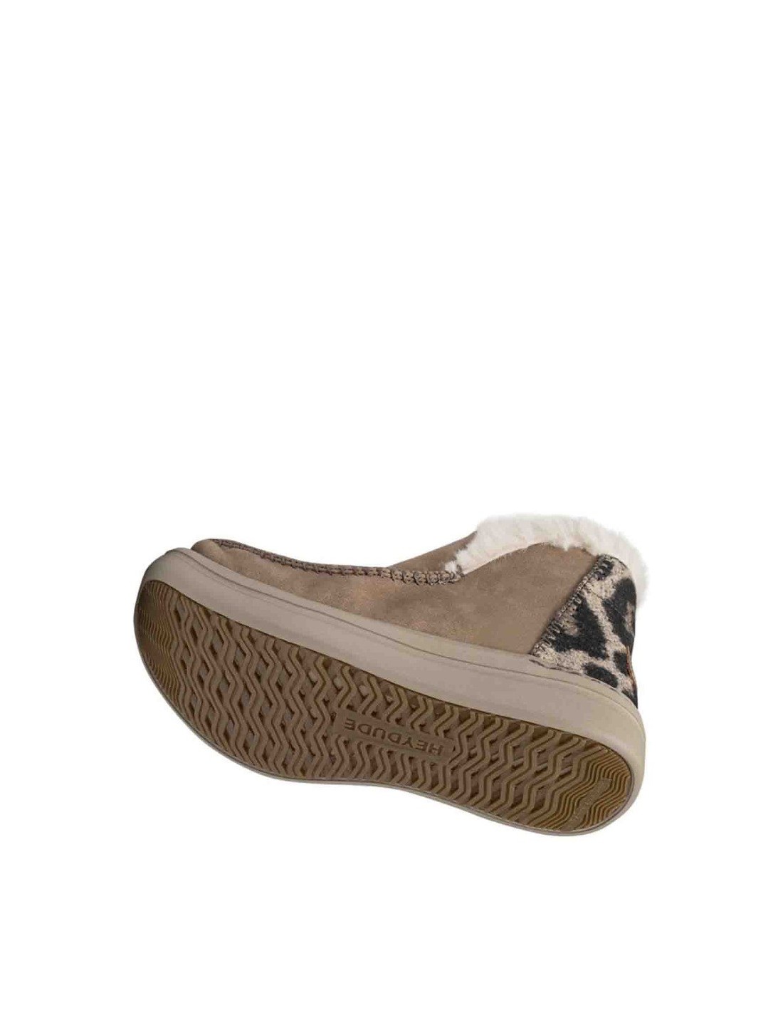Botín de la marca Heydude para mujer, confeccionada mediante paneles de piel lisa y con diseño animal print reciclada tratada para repeler el agua. Plantilla extraíble de espuma de memoria perforada y forrada de cuero. Cuenta con la suela UltraLight, elaborada con materiales ligeros y muy cómodos. Sistema Easy-On que se caracteriza por la presencia de cordones elásticos que no requieren lazada. Plantilla ergonómica con memoria de espuma forrada en cuero, Modelo ecológico y ligero diseñado para un clima de frío.