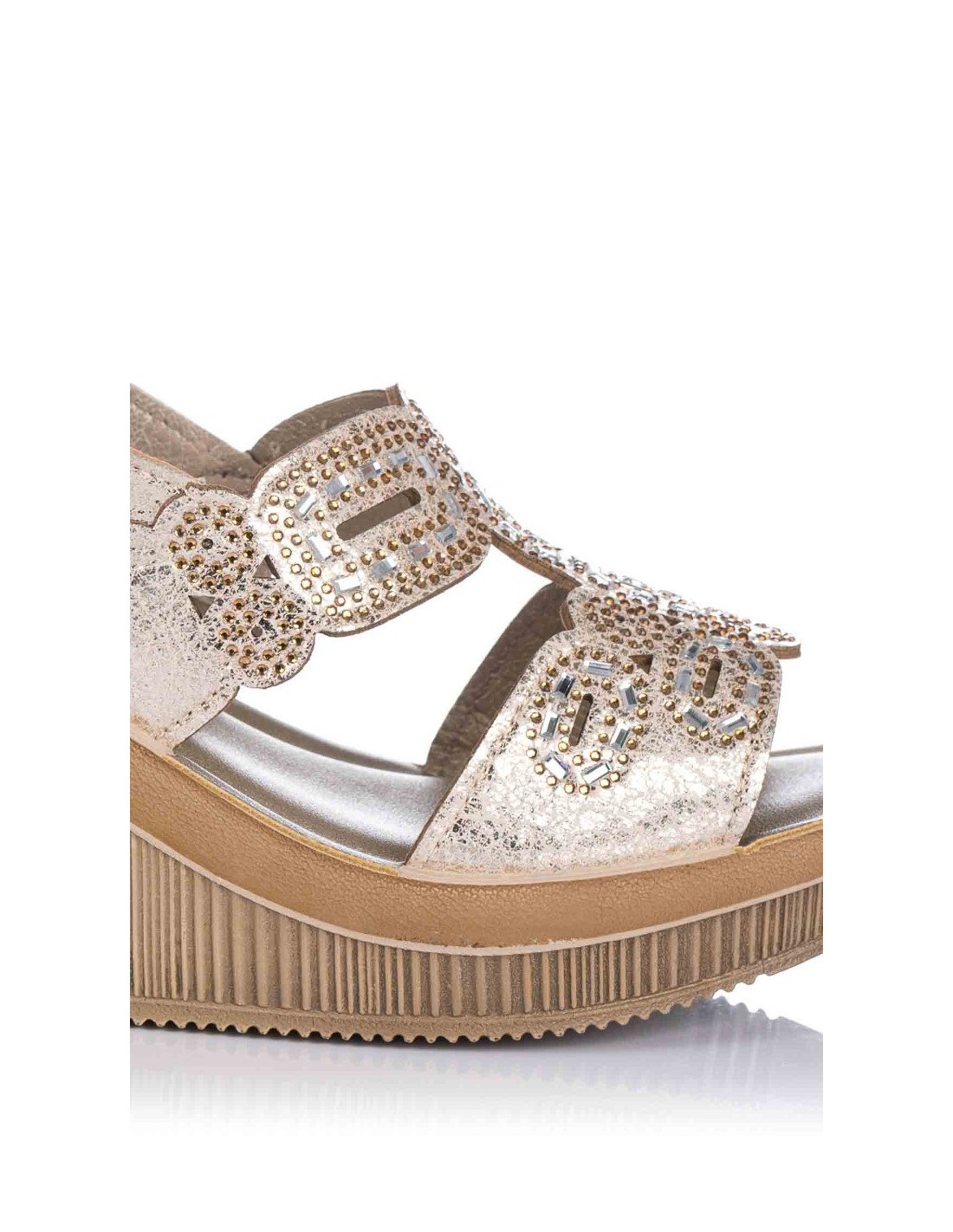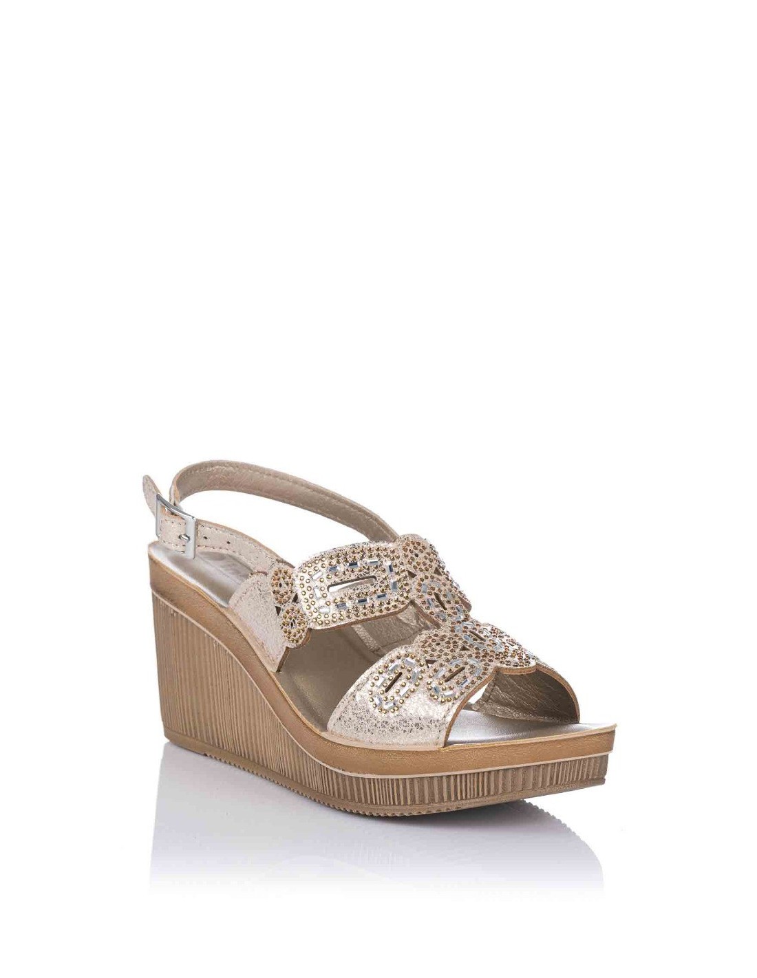 Sandalia con cuña para mujer, realizada en material sintético con adorno de pedrería en el empeine. Cierre mediante tira trasera con hebilla. Plantilla "Soft" ligeramente acolchada para mayor comodidad.