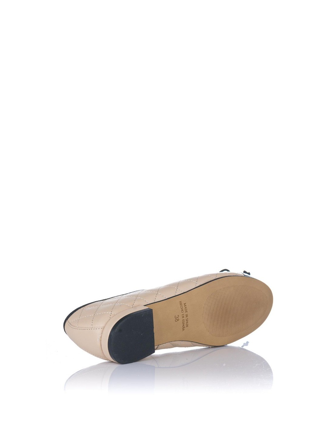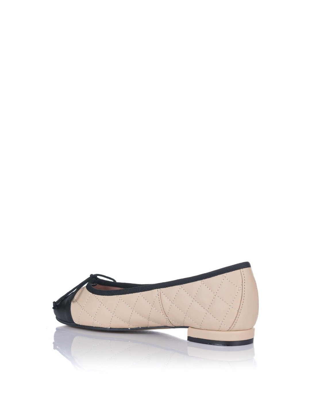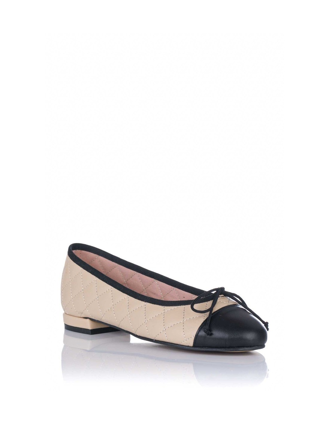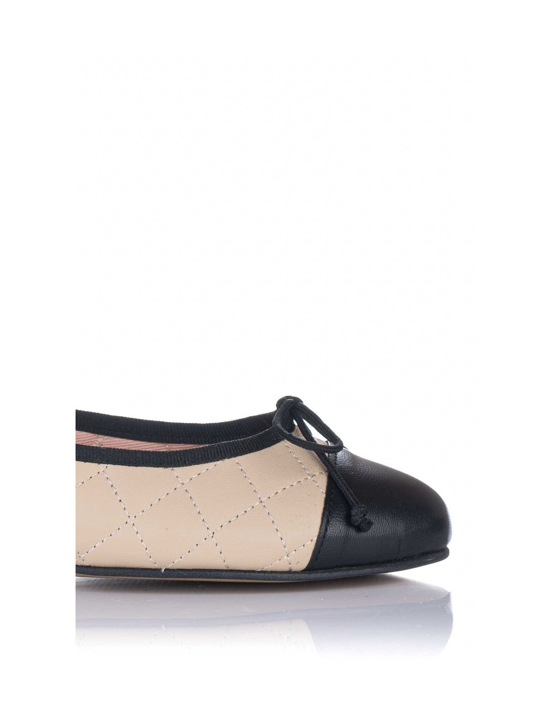 Bailarina para mujer, realizada en piel bicolor blanco y charol negro con detalle de lazo en el empeine a modo de adorno. Fabricado en España por la marca Janross.