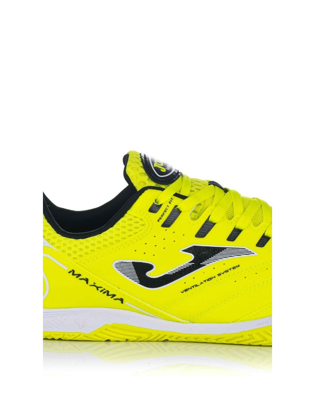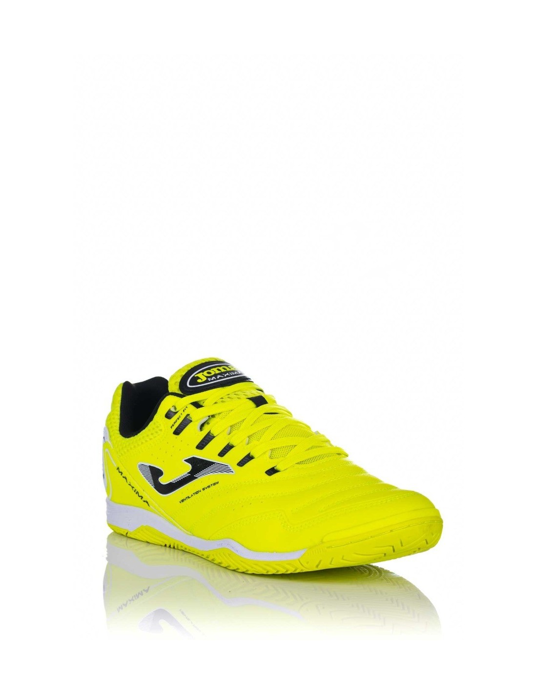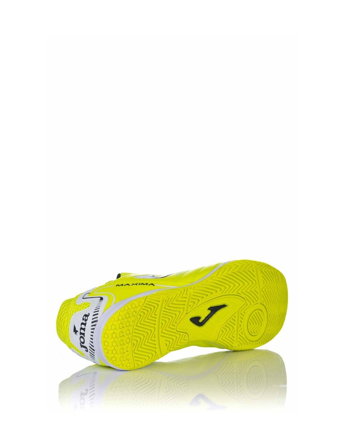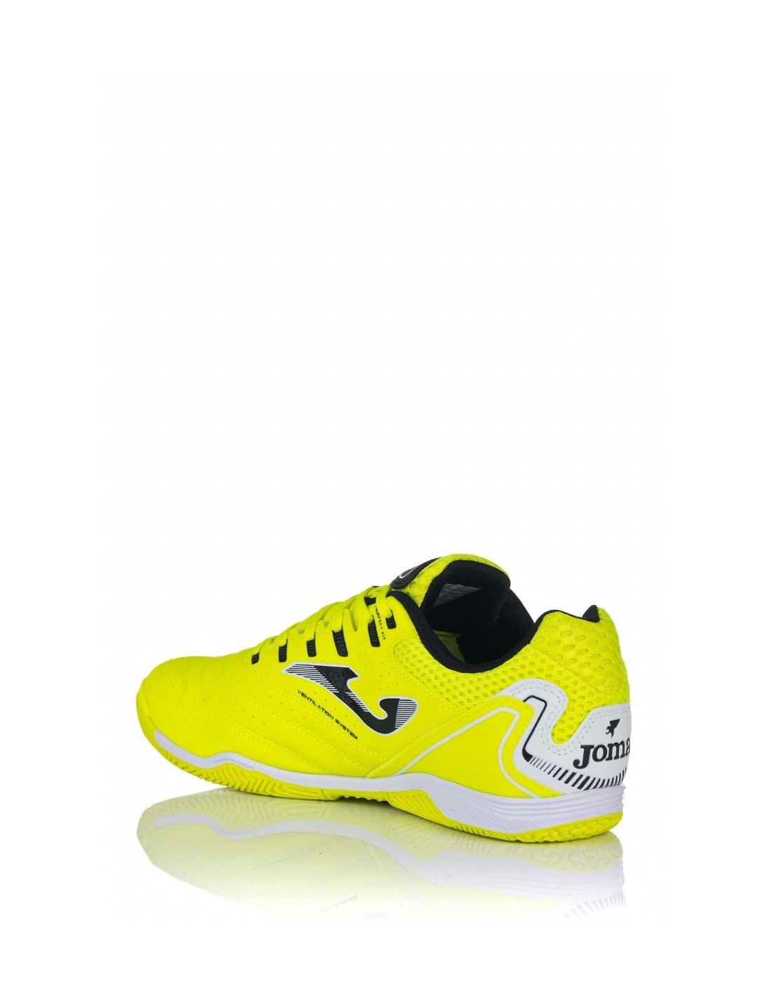 Zapatilla de fútbol indoor para hombre de la marca Joma en color amarillo fluorescente y realizado en Fibretex de alta calidad y nailon para favorecer la transpiración. Cierre mediante cordones para una mayor sujeción al pie y plantilla lisa fabricada en texon. Sistema Flex suela, que permite mejor flexión y torsión.