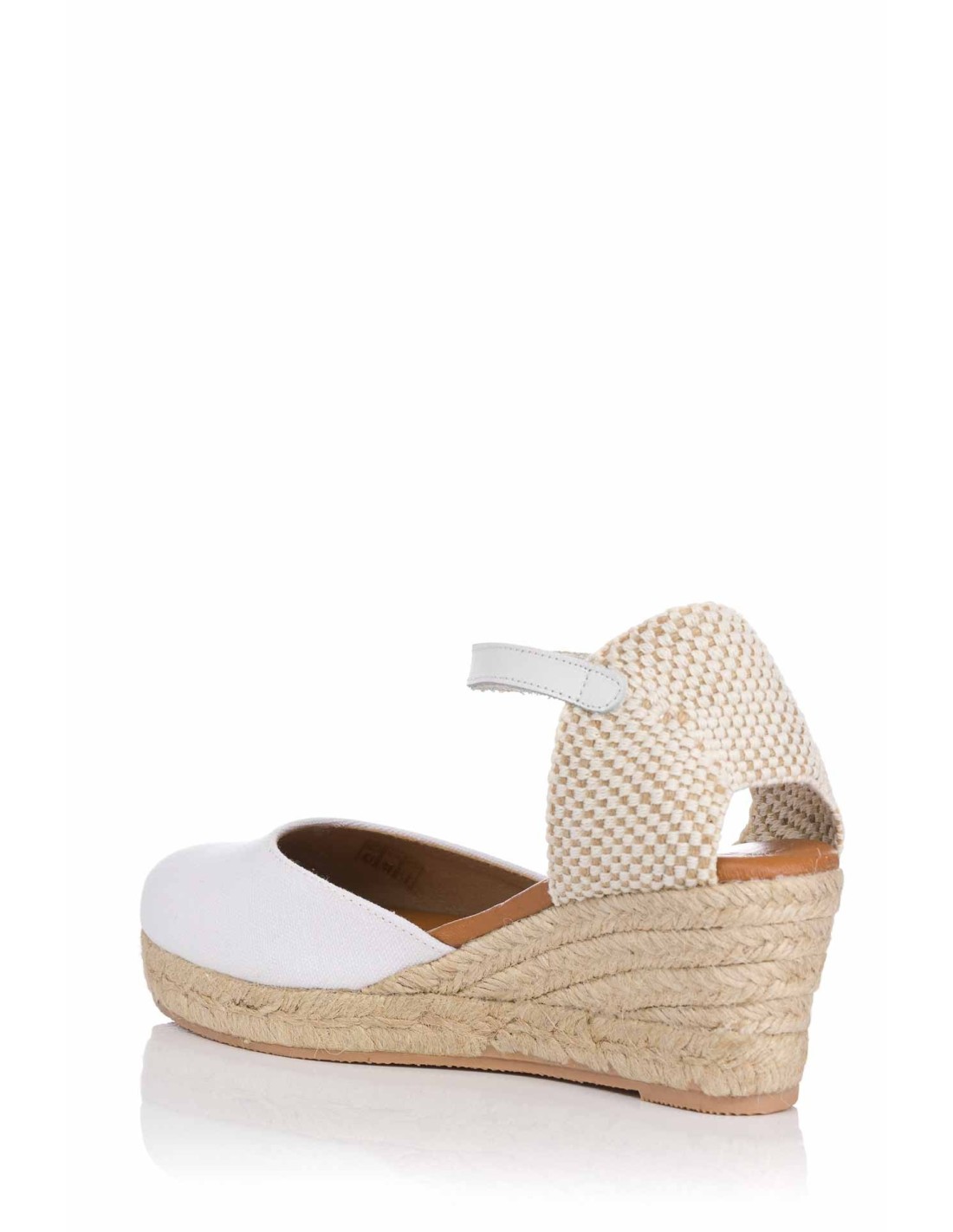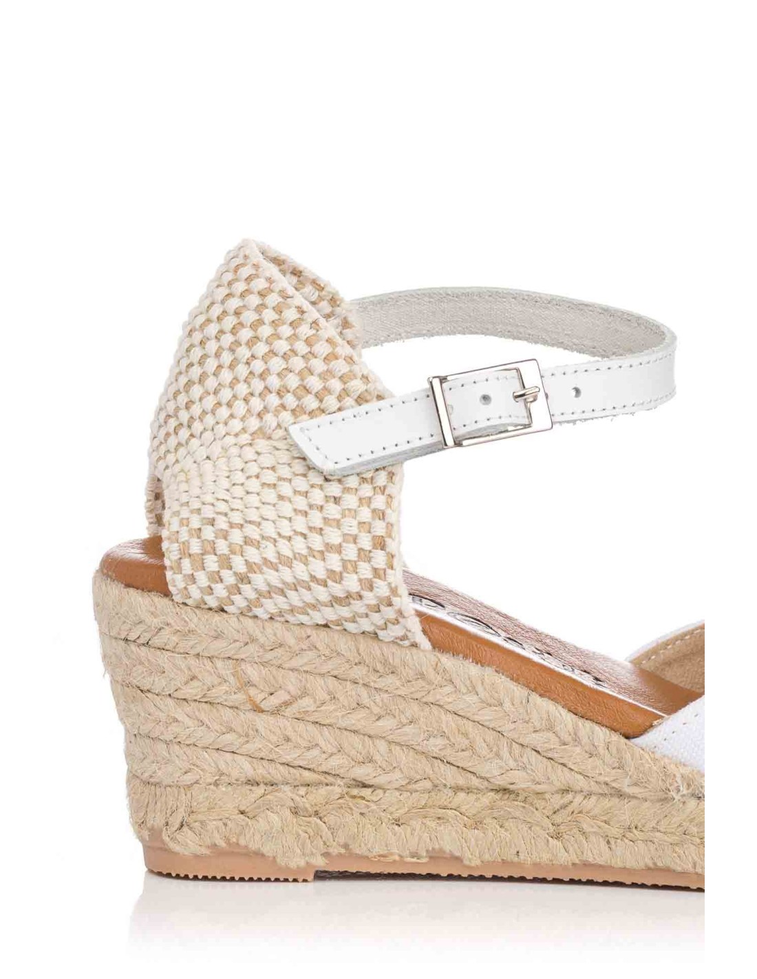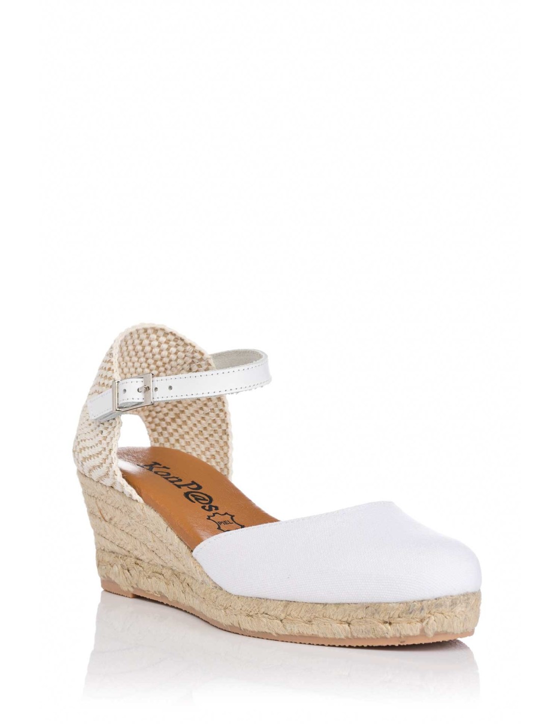 Sandalia con cuña de la marca KonP@s para mujer, realizada en material textil y pulsera de piel con hebilla ajustable que facilita su calce y ajuste al pie. Planta de piel acolchada de gran comodidad y suavidad en la pisada. Cuña de esparto y suela de goma para mayor agarre. Fabricada en España.