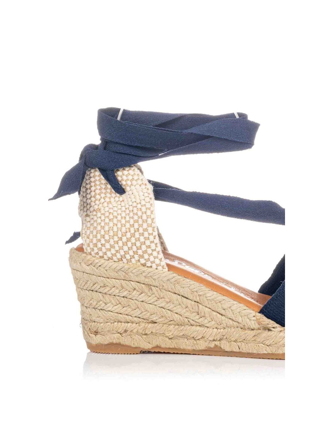 Sandalia valenciana de la marca KonP@s para mujer, realizada en lona textil y talonera de lino con cintas para atar a la pierna. Planta de piel acolchada de gran comodidad y suavidad en la pisada. Cuña de esparto y suela de goma para mayor agarre. Fabricada en España