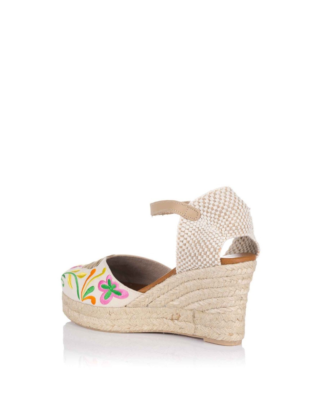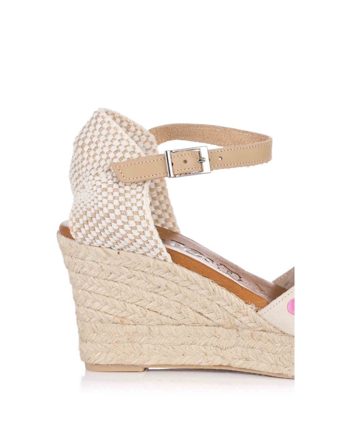 Alpargata para mujer, realizada en combinación piel y textil en color azul marino con diseño de flores. Cierre mediante hebilla en pulsera tobillera. Planta de piel acolchada de gran confort y suavidad en la pisada. Entre suela forrada de esparto y suela de goma para mayor agarre.