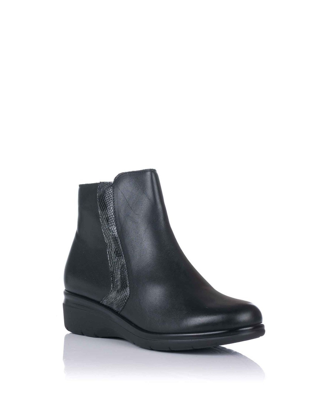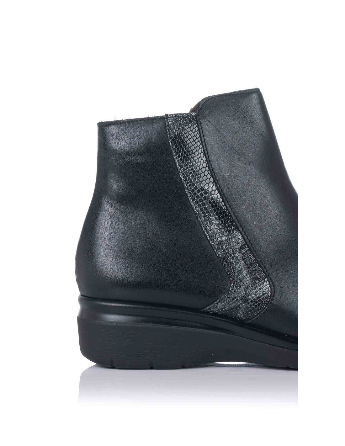 Botín para mujer de la marca Pitillos, realizado en piel combinada en lisa y textura serpiente. Forro interior en textil suave al tacto y plantilla extraíble. Cierre con cremallera lateral facilitar el calce.