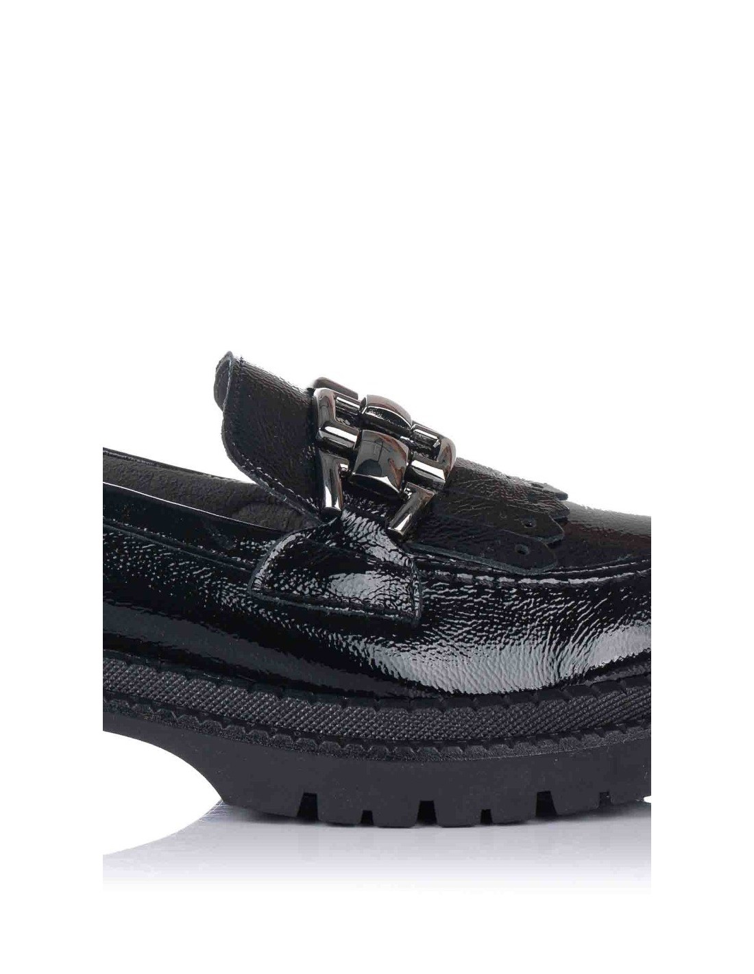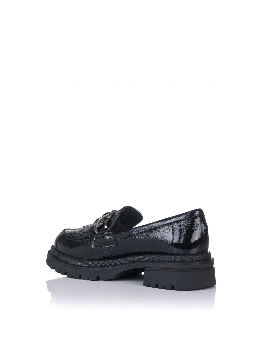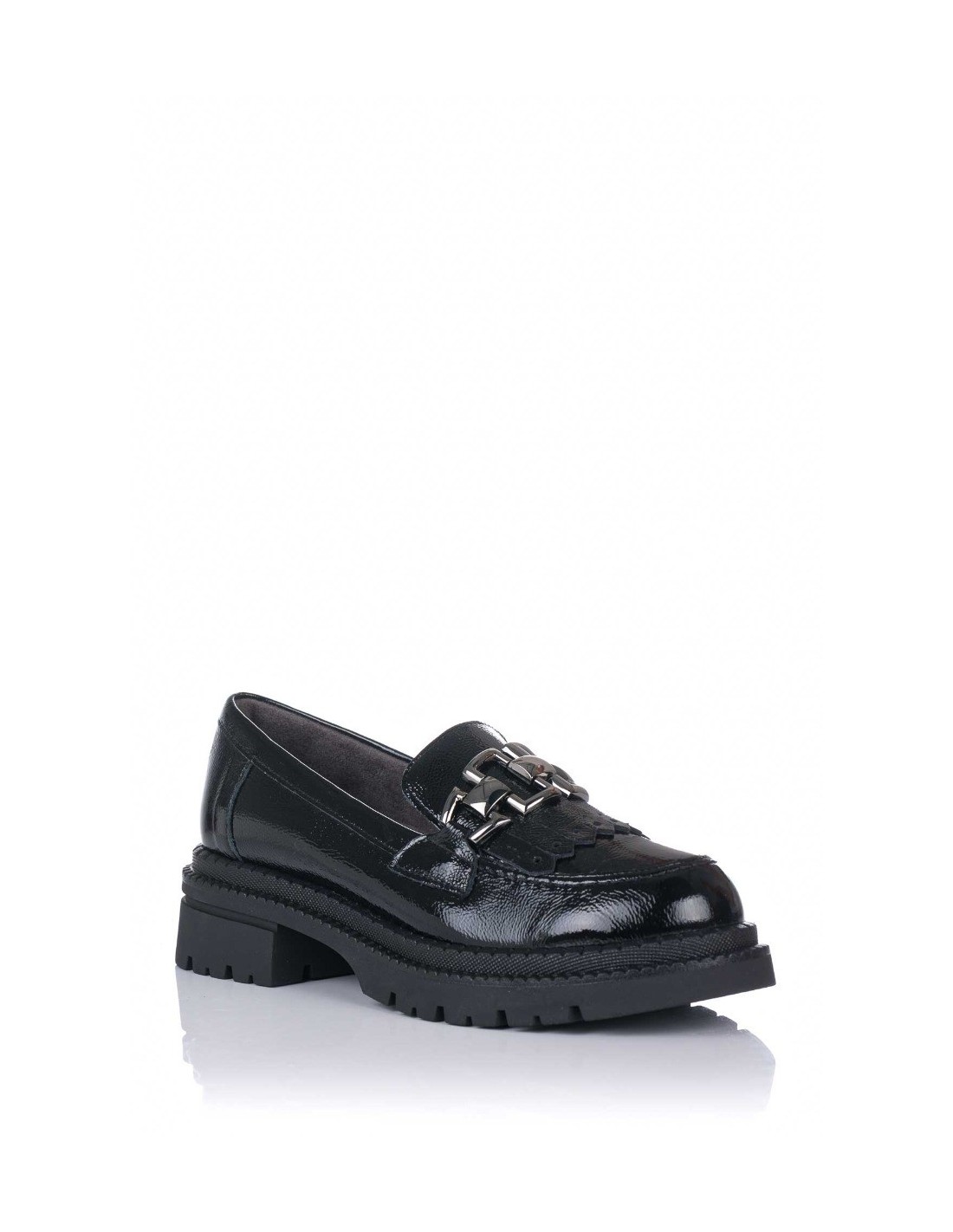 Zapato mocasín para mujer de la marca Pitillos, realizado en piel charol en color negro con detalle de cadena y flecos en el empeine a modo de adorno. Forro interior en textil y plantilla extraíble. Fabricado en España por la marca Pitillos. Elásticos laterales para un mayor ajuste al pie.