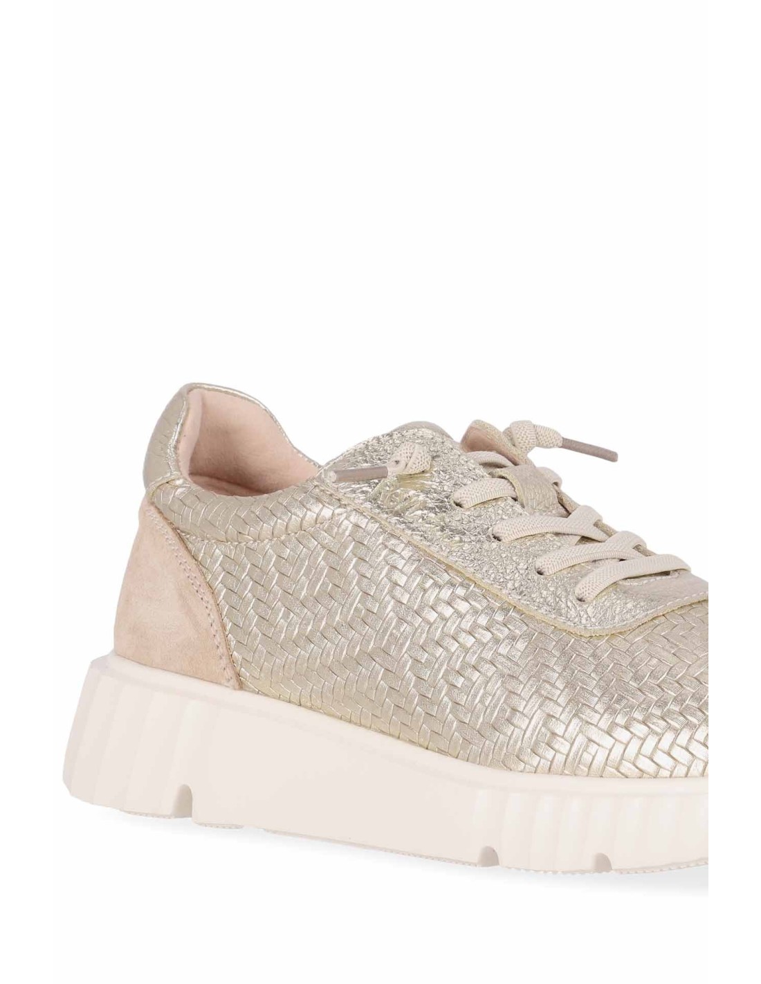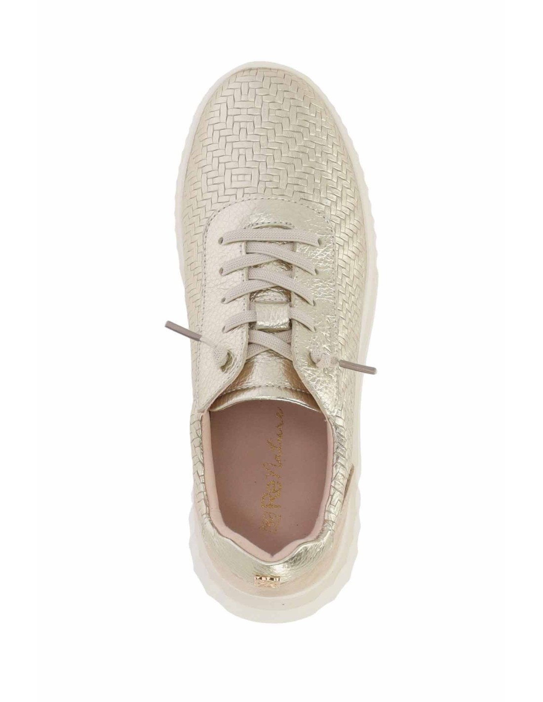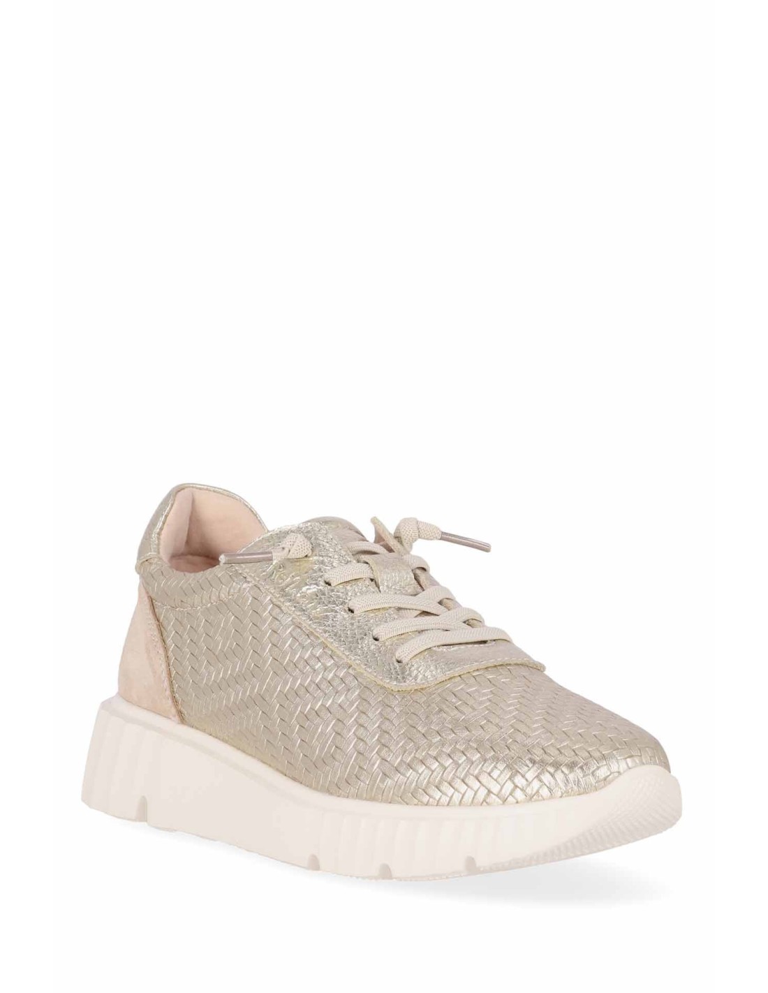 Deportivo con cuña de mujer de la marca Renature. Exclusivas zapatillas de piel en color platino, con detalles grabados y un elegante parche de ante en el talón. La suela gruesa y ligera y su cierre de cordones elásticos, proporciona comodidad y estilo, haciendo de este calzado una opción sofisticada para cualquier ocasión.