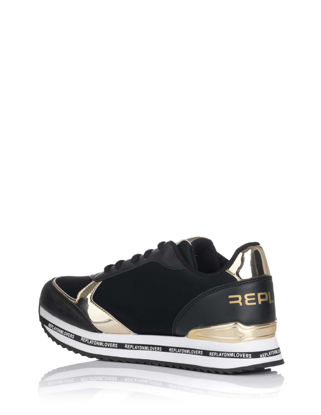Zapatilla para mujer de la marca Replay, realizada en material textil con refuerzos en charol sintético. Cierre con cordones para conseguir un total ajuste al pie. Detalle del logo de la marca con brillantes en dolor dorado en el lateral exterior. Plantilla acolchada para una mayor comodidad y suela de eva y goma dentada para una mayor ligereza.
