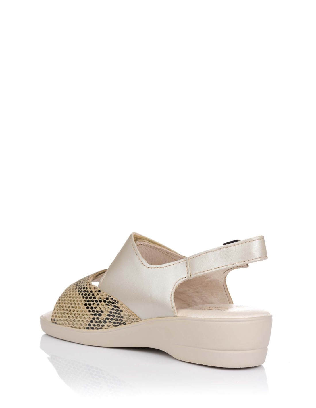 Sandalia de la marca S@kut para mujer, realizada en piel de primera calidad en color beige metalizado combinado con print serpiente. Cierre de doble velcro ajustable sobre la pala y tira trasera también con velcro. Plantilla “soft confort” acolchada de gran comodidad.