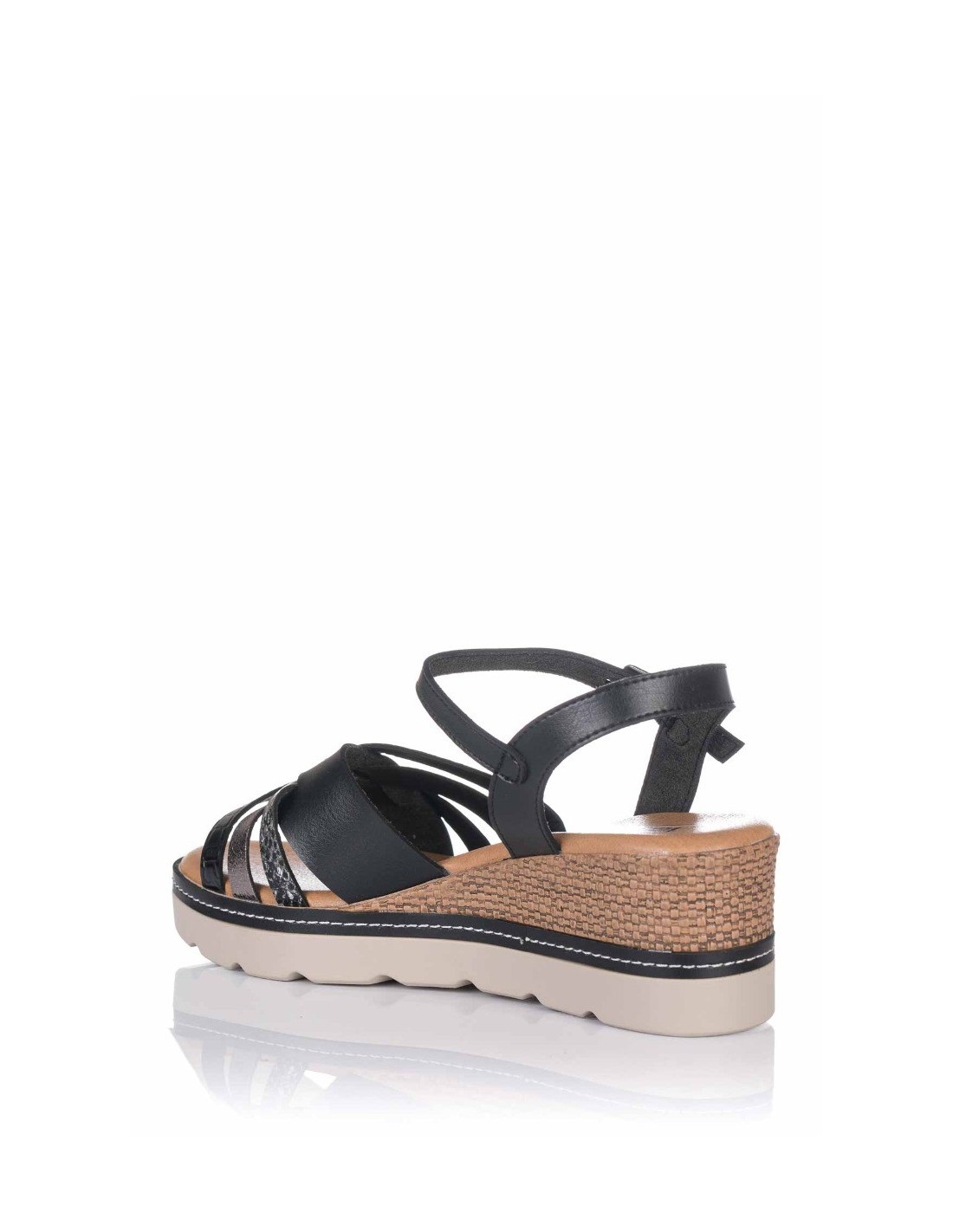 Sandalia con cuña de la marca V&D Coleccion para mujer. Realizado en material sintético con tiras cruzadas formando el empeine. Cierre mediante hebilla en pulsera tobillera Plantilla de gel de gran comodidad.