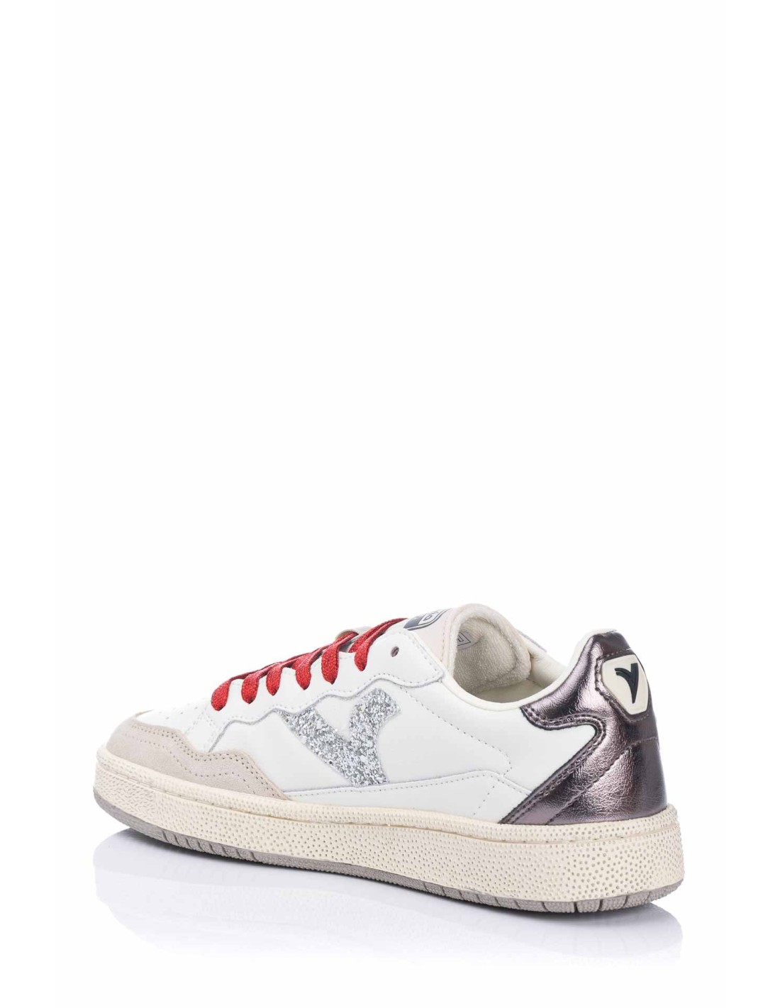 Zapatillas para mujer de la marca Victoria, fabricada piel con detalles en PU. Logotipo de la marca en el lateral con toques de gliter. Cierre mediante cordones bicolor. Plantilla de alta densidad para mayor confort, y puntera perforada para favorecer la transpiración. Suela de caucho 100- natural efecto envejecido.