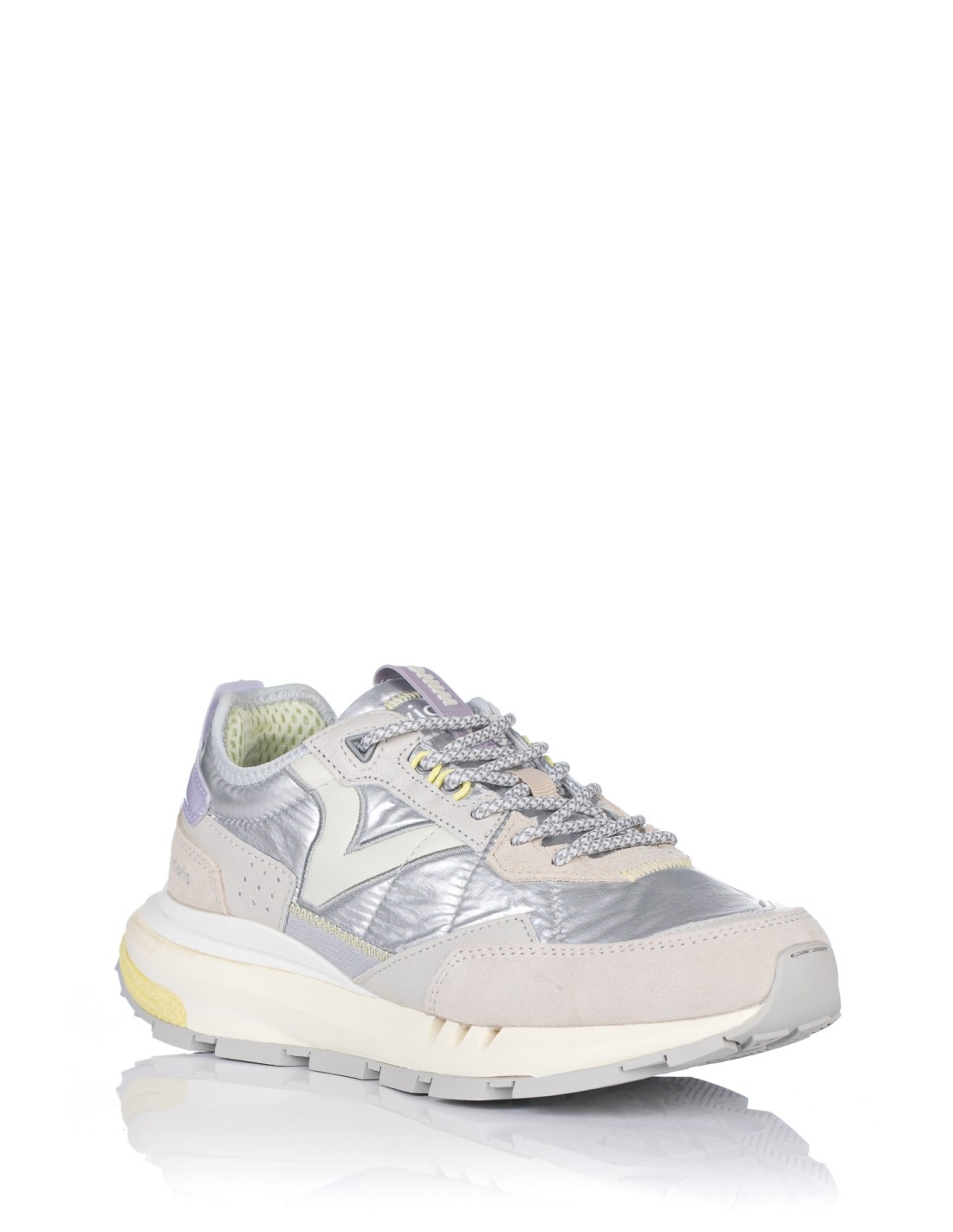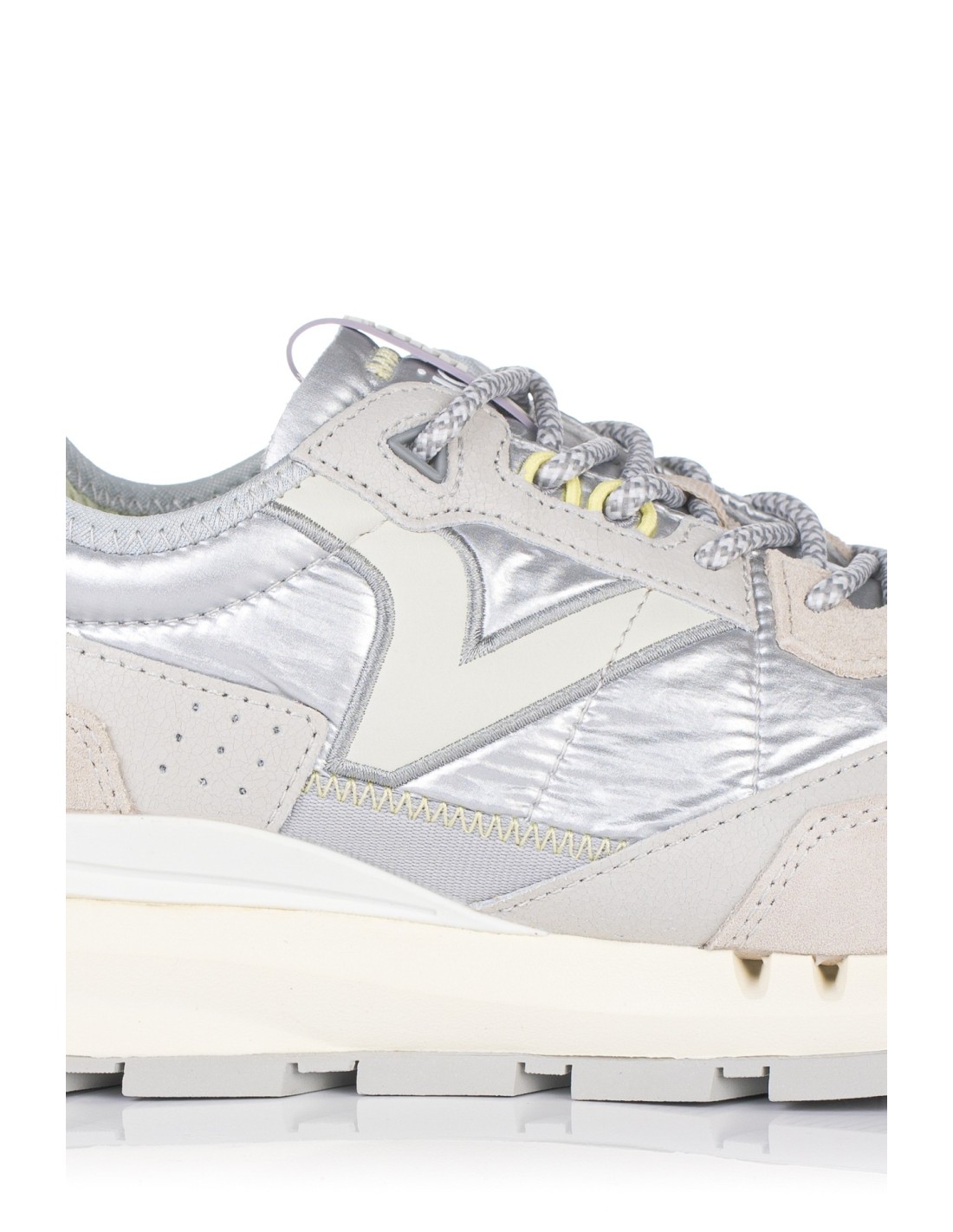 Zapatillas para mujer de la marca Victoria, fabricada en nylon laminado metalizado con piezas superpuestas de serraje y detalles en PU. Logotipo de la marca en el lateral en TPU en contraste. Plantilla de alta densidad para mayor confort. Suela en sierra de phylon y caucho 100- natural.