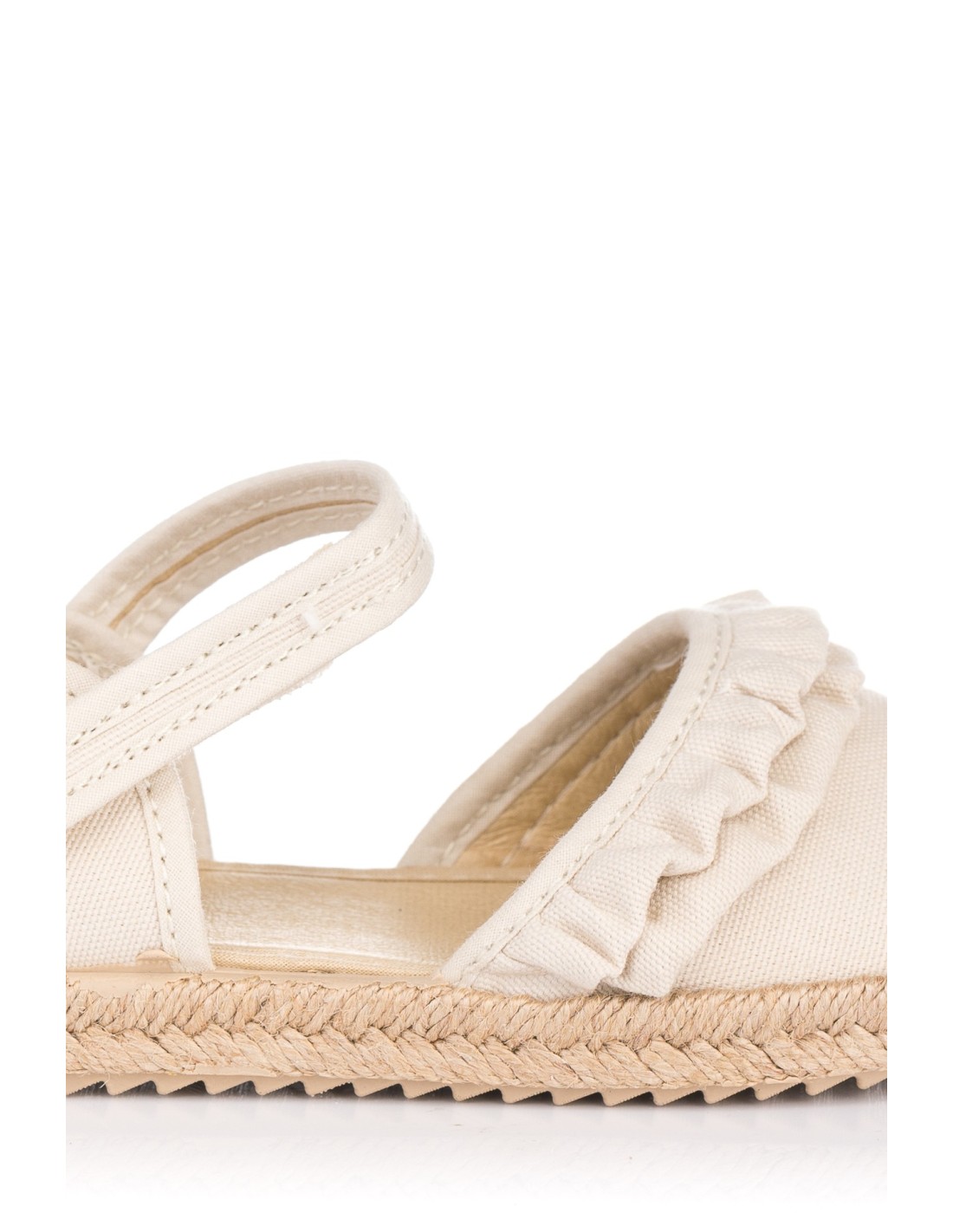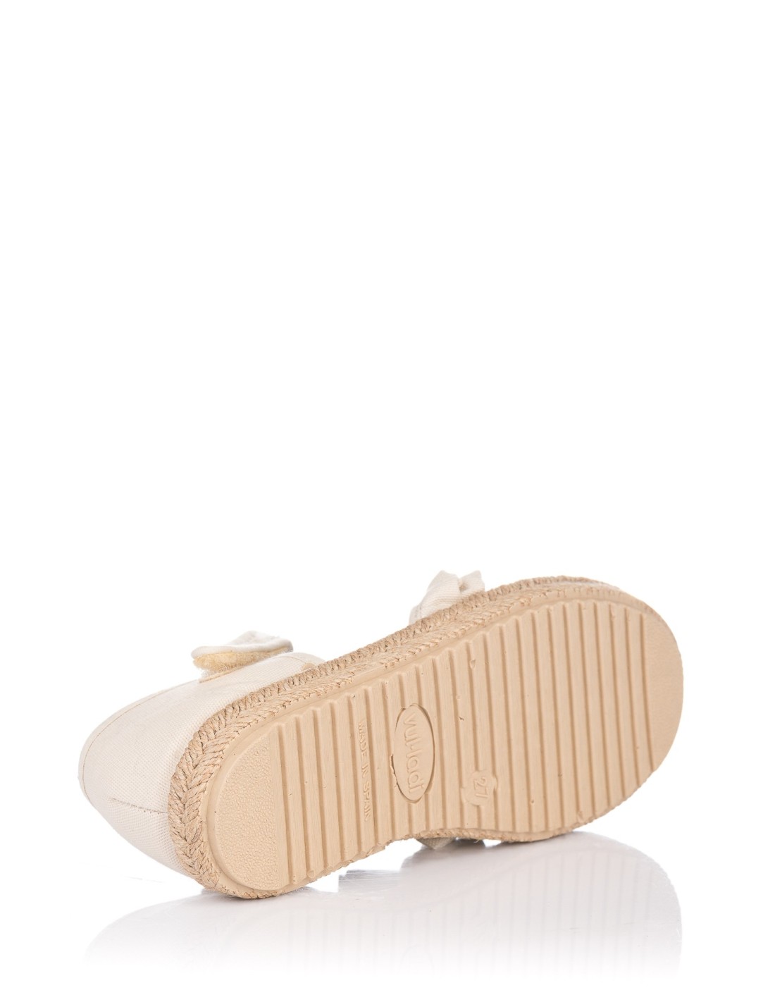 Alpargata de la marca Vul-ladi para niña, realizada en lona con adorno de volantes. Plantilla acolchada de gran comodidad. Cierre de pulserita con velcro para un perfecto ajuste. Vira de esparto y suela de goma. Fabricado en España.