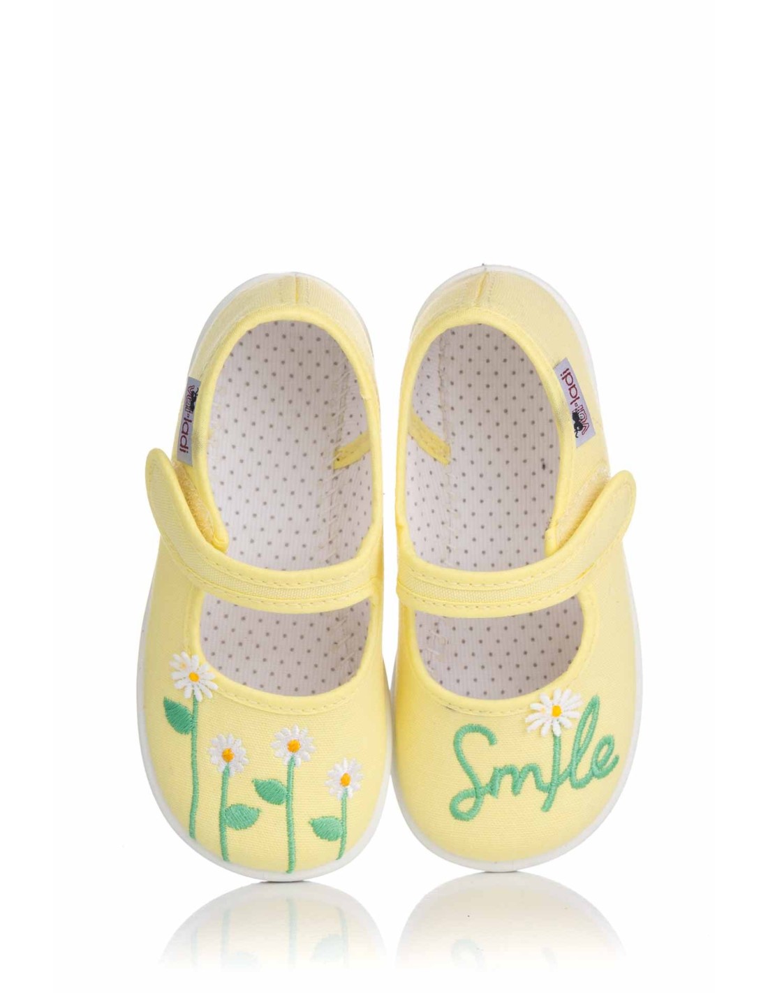 Merceditas Vul-Ladi en color amarillo limón para niña, confeccionada en lona con un bonito bordado de flores y mensaje “Smile”, forro interior con estampado de topitos y cierre de velcro regulable para facilitar el calce del pie. Suela de caucho vulcanizada. Fabricado en España.