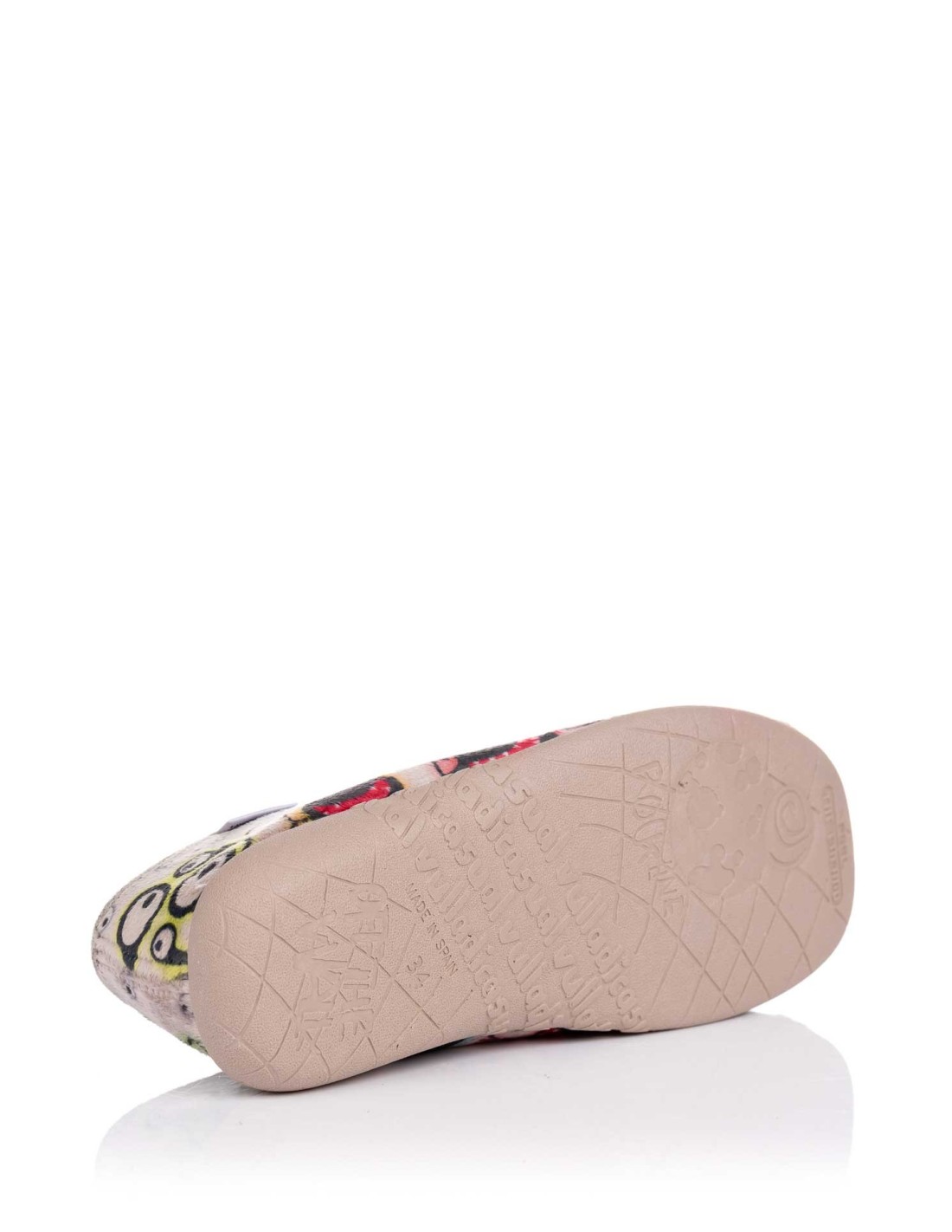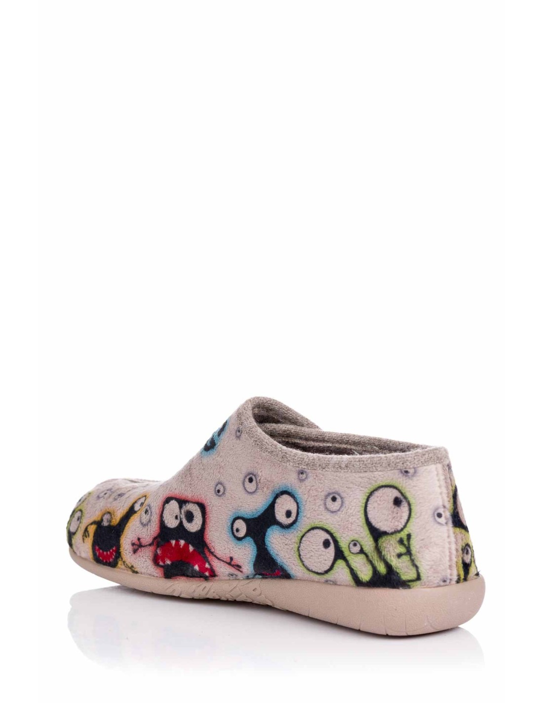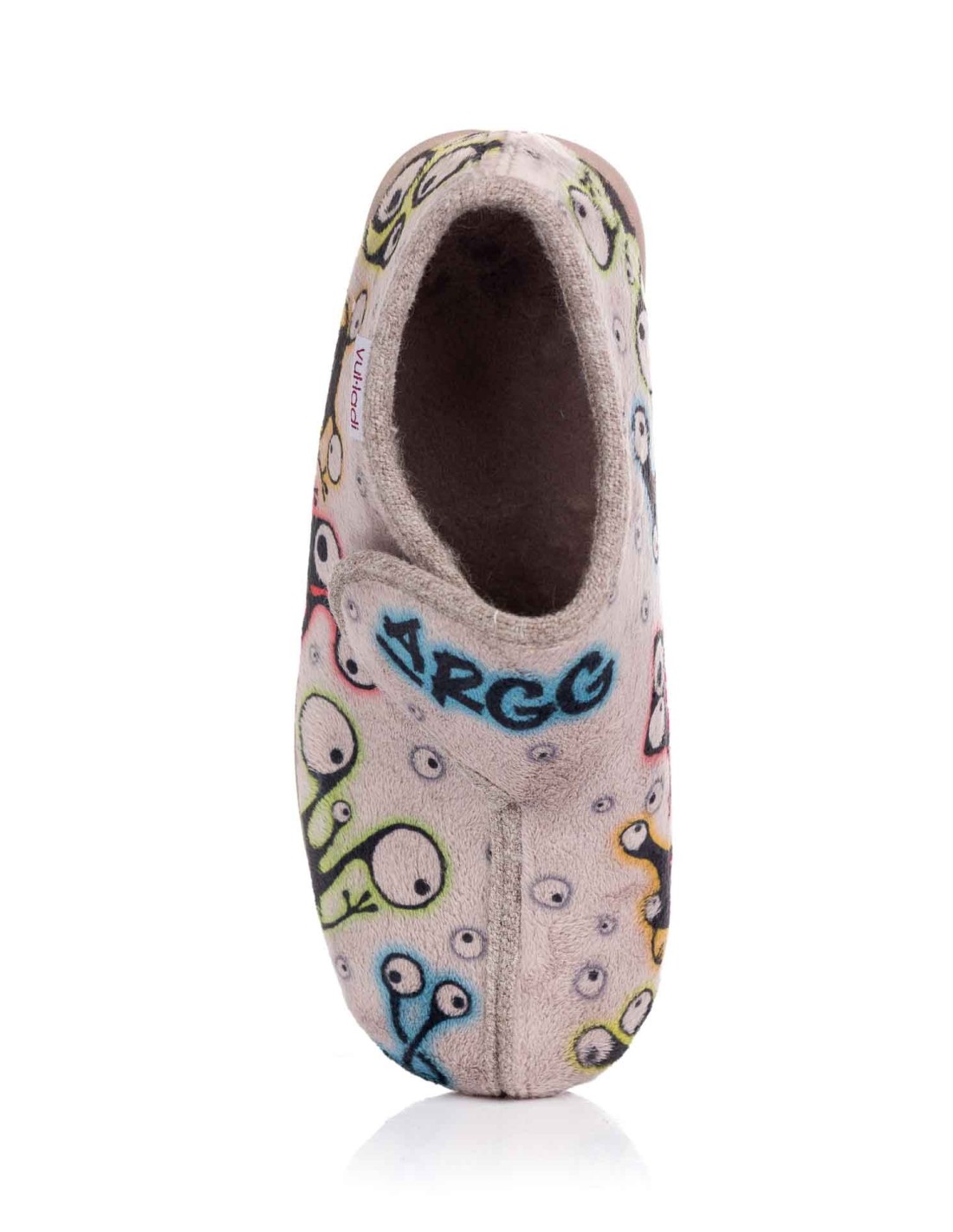Zapatilla de andar por casa de la marca Vul ladi para niño. Fabricada en un suave tejido invernal con diseño de divertidos dibujos. Cierre de velcro lateral para una buena sujeción y facilitar el calce del pie. Fabricado en España